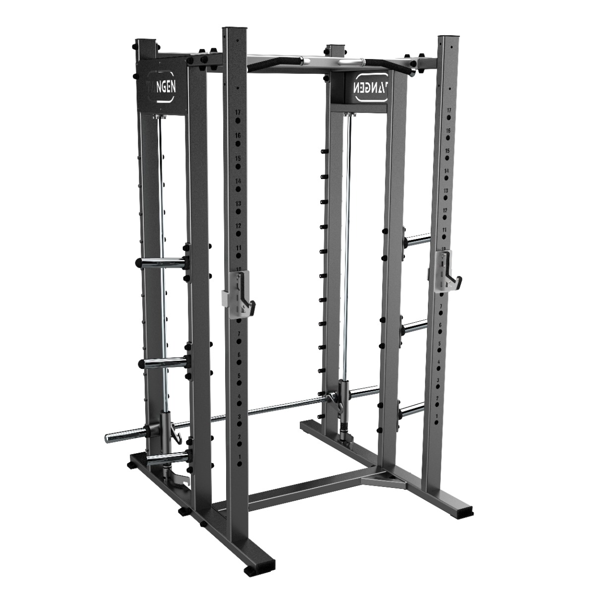 Фиксация грифа выполняется при помощи 12 точек вертикальной фиксации и двух подпружиненных захватов, позволяющих быстро и безопасно зафиксировать штангу в любом положении. Все фиксаторы оснащены пластиково-резиновыми накладками, обеспечивающими амортизацию при контакте и защиту металлических элементов от износа и повреждений.