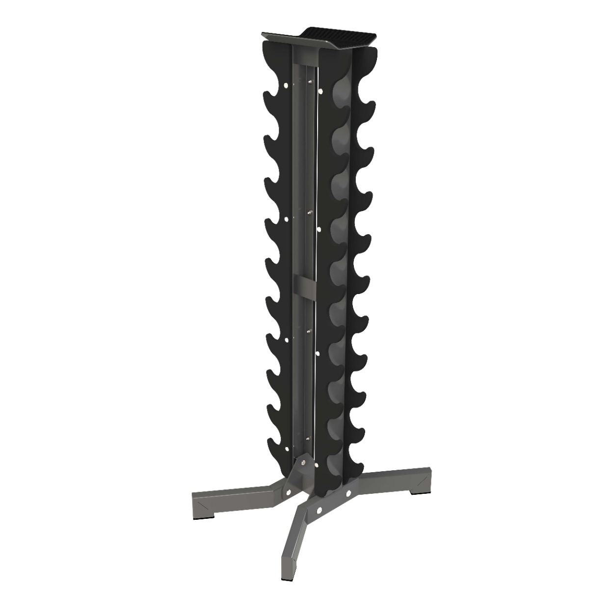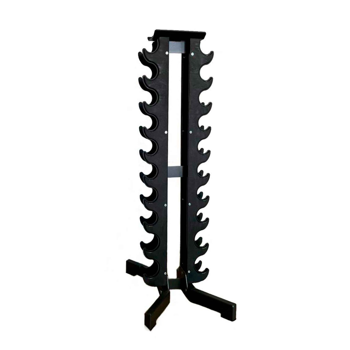 Стойка предназначена для хранения и удобного использования гантелей ряда CHROME и гексагональных обрезиненных гантелей весом 1-10 кг, длиной рукояти не менее 110 мм. Представляет собой сборную металлическую конструкцию с двумя вертикальными полками и ложементами под гантели.