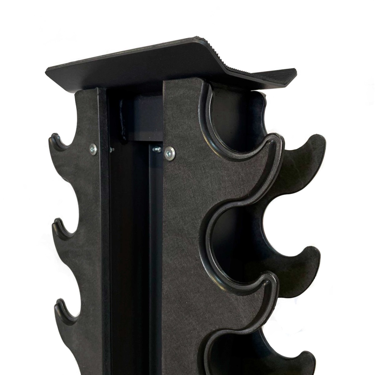 Верхняя часть подставки (крышка для хранения) изготовлена из листового металла толщиной 3 мм с резиновым рифленым ковриком для предотвращения скатывания гантели или других предметов.