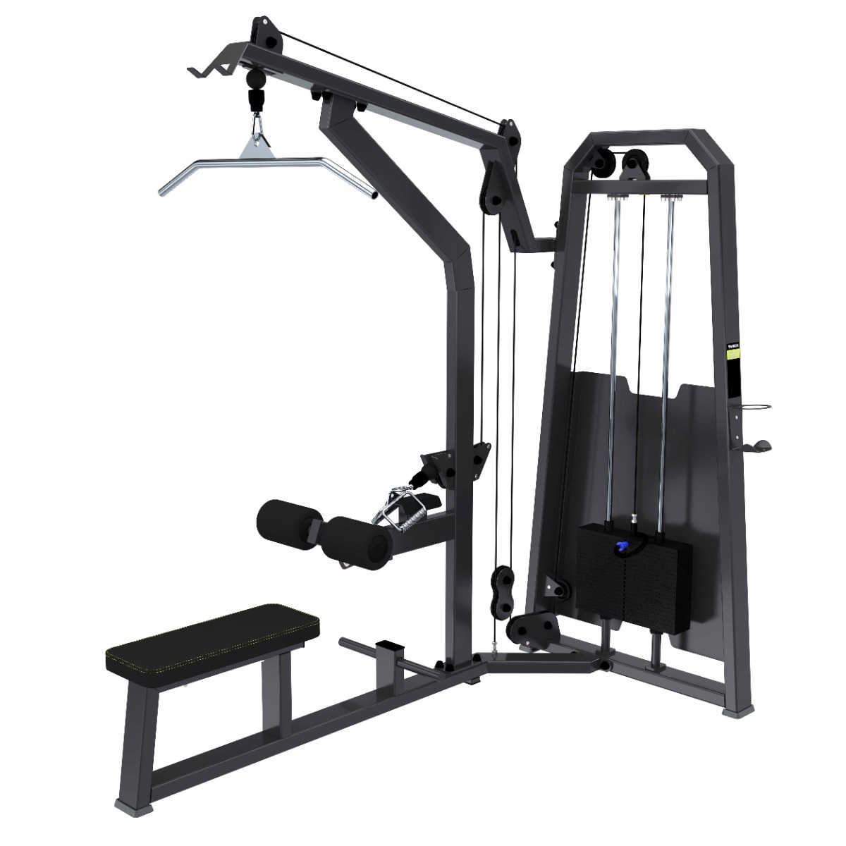 Профессиональный тренажёр TANGEN A2085 Тяга сверху / Гребная тяга предназначен для изолированной тренировки широчайших и круглых мышц спины. Конструкция объединяет функции вертикальной и горизонтальной тяги, обеспечивая равномерное распределение нагрузки по всей траектории движения и высокую вариативность упражнений. Несущая конструкция изготовлена из стального профиля 100×50 мм с толщиной стенки 3 мм. Конструкция рамы и элементы изготовлены на высокоточном лазерном оборудовании с ЧПУ. Система нагрузки – тросовая, с весовым стеком 100 кг. Весовой стек выполнен из стальных плит с порошковым покрытием. Направляющие стека изготовлены из нержавеющей стали диаметром 20 мм, обеспечивающей точное линейное перемещение плит. С внешней стороны грузоблока выполнена сплошная металлическая защита стека. Тренажёр выполнен в сдвоенной конфигурации и объединяет в одном корпусе вертикальную и горизонтальную тягу. Сиденье выполнено в фиксированном положении. Валики для фиксации ног при выполнении вертикальной тяги регулируются по диагонали, обеспечивая надёжную фиксацию корпуса и адаптацию под рост пользователя. Для выполнения горизонтальной тяги предусмотрен упор для ног, обеспечивающий устойчивое положение спортсмена. Рукояти для выполнения упражнений - сменные, что позволяет использовать различные варианты хвата и расширять функциональные возможности тренажёра. В комплекте к тренажеру предусмотрены две рукояти: для узкого параллельного хвата и для тяги за голову. В верхней части рамы предусмотрен металлический держатель для хранения рукояти в нерабочем положении, обеспечивающий удобство и безопасность эксплуатации. Мягкие элементы тренажёра выполнены с наполнителем из вспененного полиуретана оптимальной плотности, обеспечивающим комфорт и стабильную поддержку во время выполнения упражнения. Обивка мягких элементов выполнена из износостойкой искусственной кожи чёрного цвета. Цвет обивки может быть изменён под заказ. На металлические элементы после антикоррозийной обработки нанесено двухслойное порошковое напыление для обеспечения стойкости при механических воздействиях. Цветовое исполнение рамы – графит (возможна индивидуальная окраска под проект). Торцы профиля закрыты пластиковыми заглушками с фиксаторами. Соединения выполнены с применением оцинкованного резьбового крепежа. Габариты: 2330×1470×2060 мм. Вес: 264 кг. Профиль: 100×50×3 мм. Производитель: TANGEN. Соответствует международным стандартам качества и безопасности. Производитель оставляет за собой право (без предварительного уведомления) на внесение изменений в конструкцию, комплектацию или технологию изготовления тренажера для улучшения эксплуатационных качеств. Изделие внесено в Реестр российской промышленной продукции в соответствии с Постановлением Правительства РФ № 719 от 17 июля 2015 года, зарегистрировано под реестровым номером 10734704, имеет присвоенный код ОКПД 2: 32.30.14.120.
