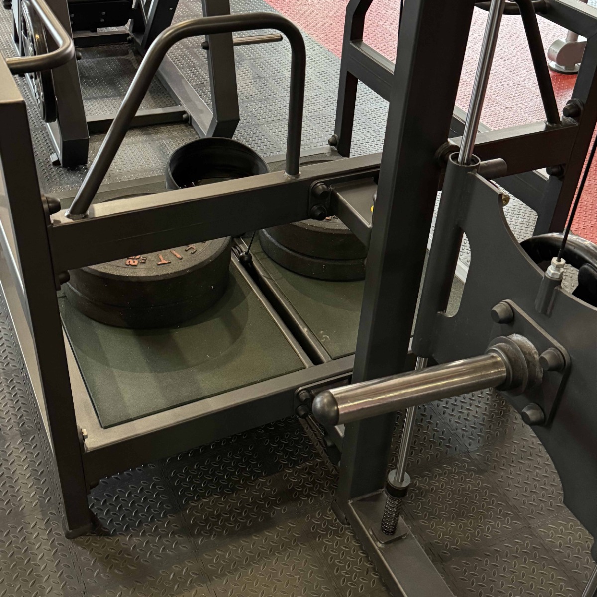 Фиксатор положения подвижного узла позволяет закрепить его в средней точке хода, облегчая навешивание дисков и начало тренировки.
