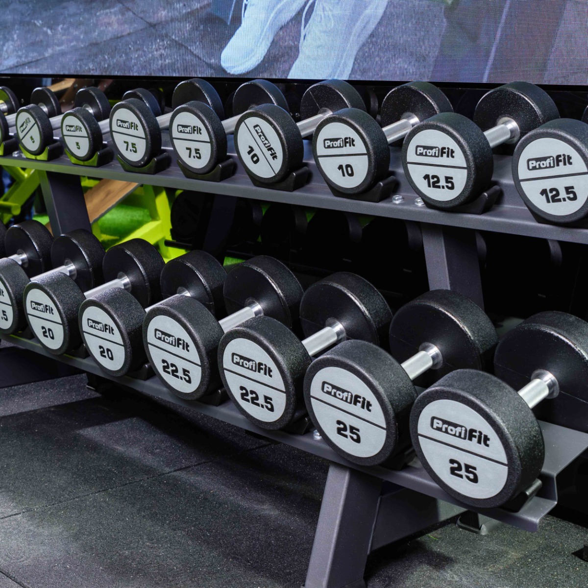 На каждой полке установлены чашеобразные пластиковые ложементы (всего 40 шт.), обеспечивающие надёжную фиксацию гантелей и предотвращающие повреждение поверхности полок.
