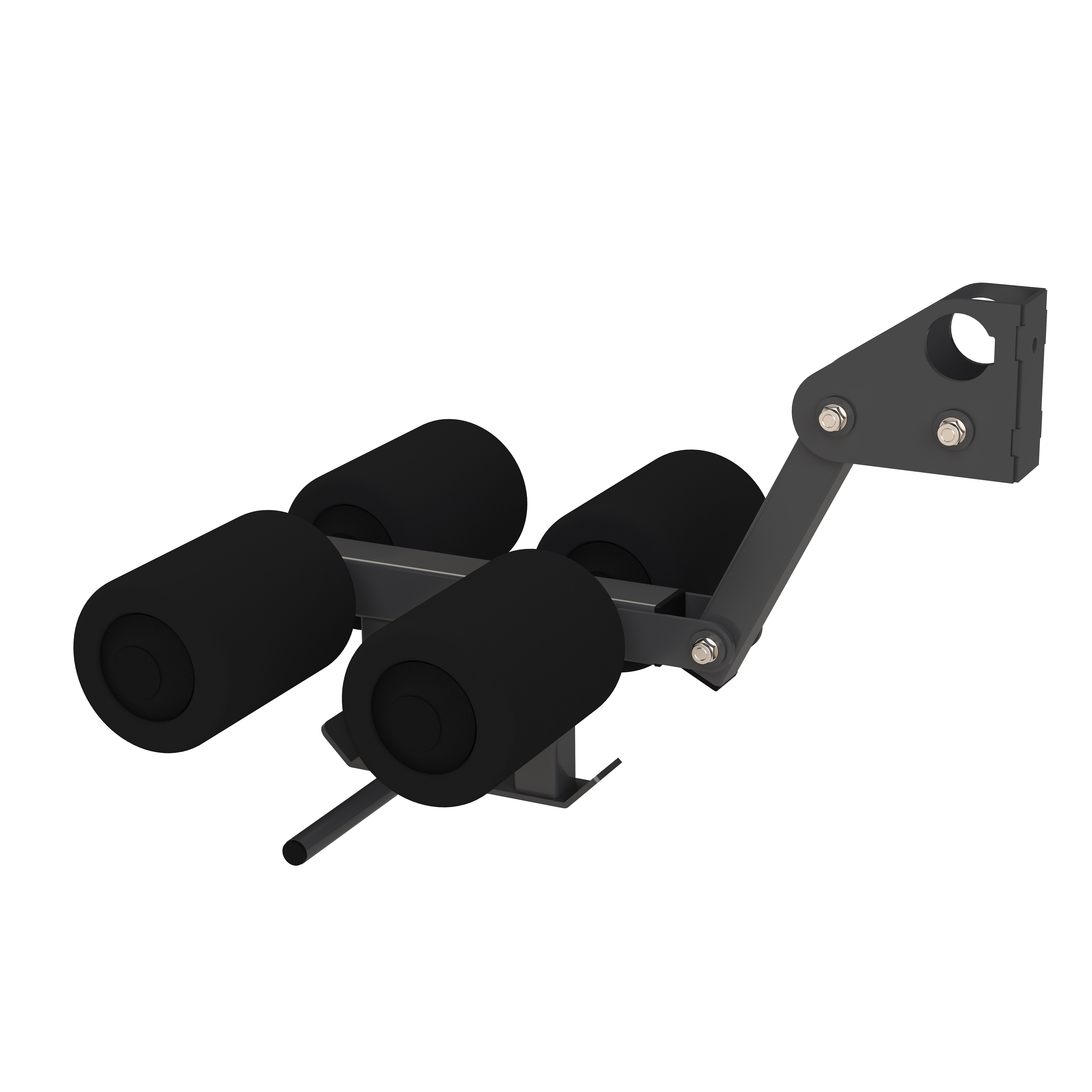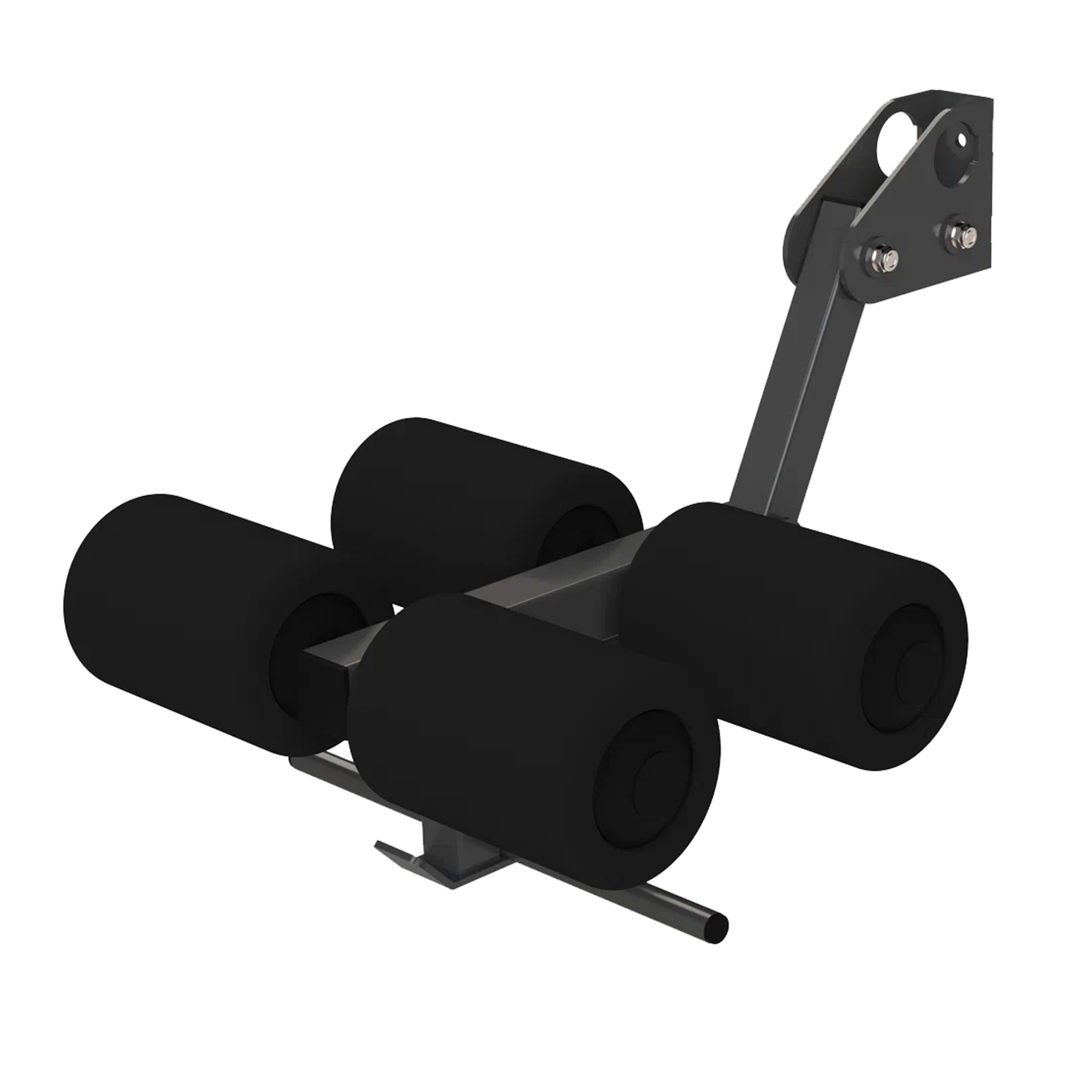 Ноги располагаются между валиками, что обеспечивает надёжную фиксацию и устойчивость при выполнении упражнения. Под валиками предусмотрена металлическая опорная перекладина для упора стоп, повышающая стабильность положения спортсмена.