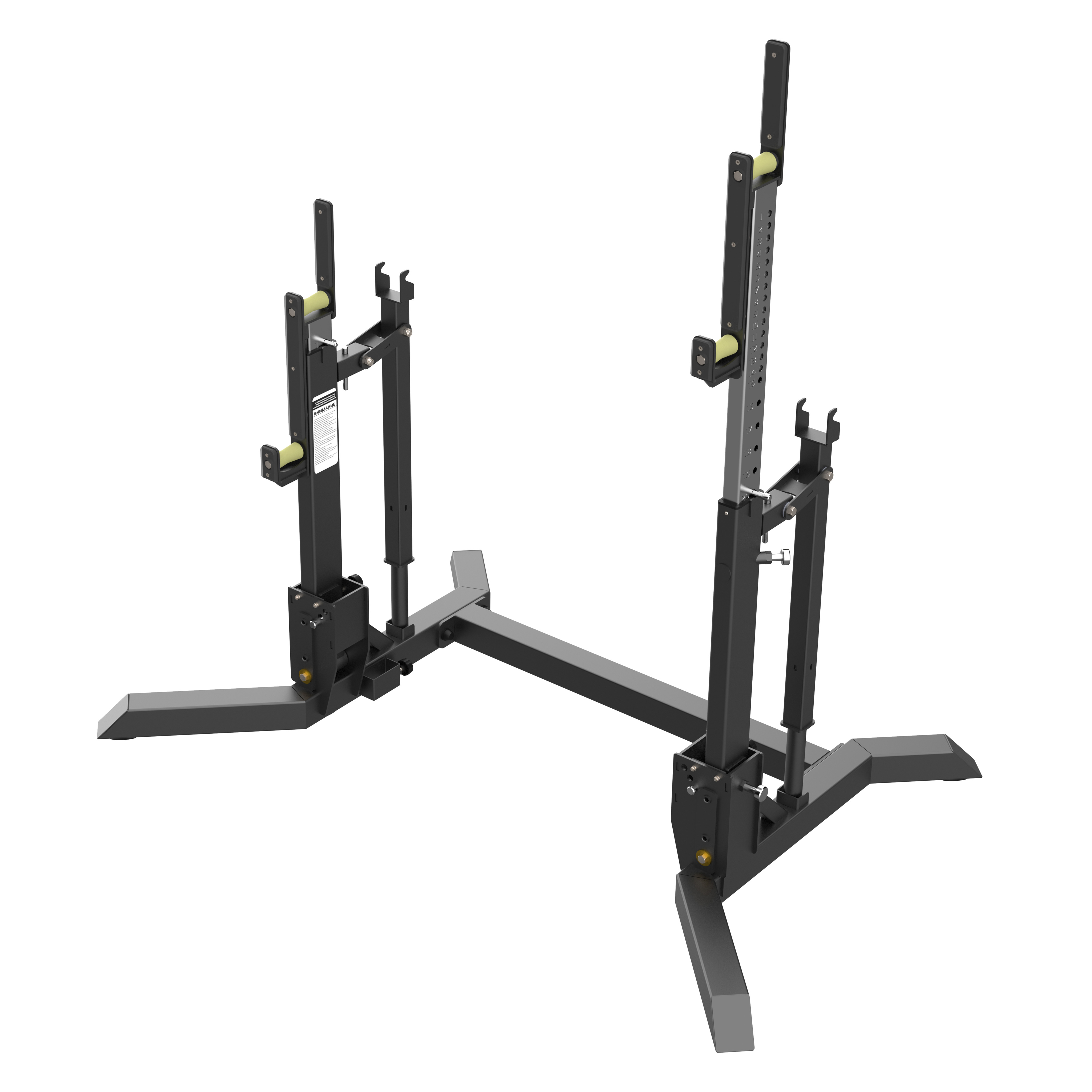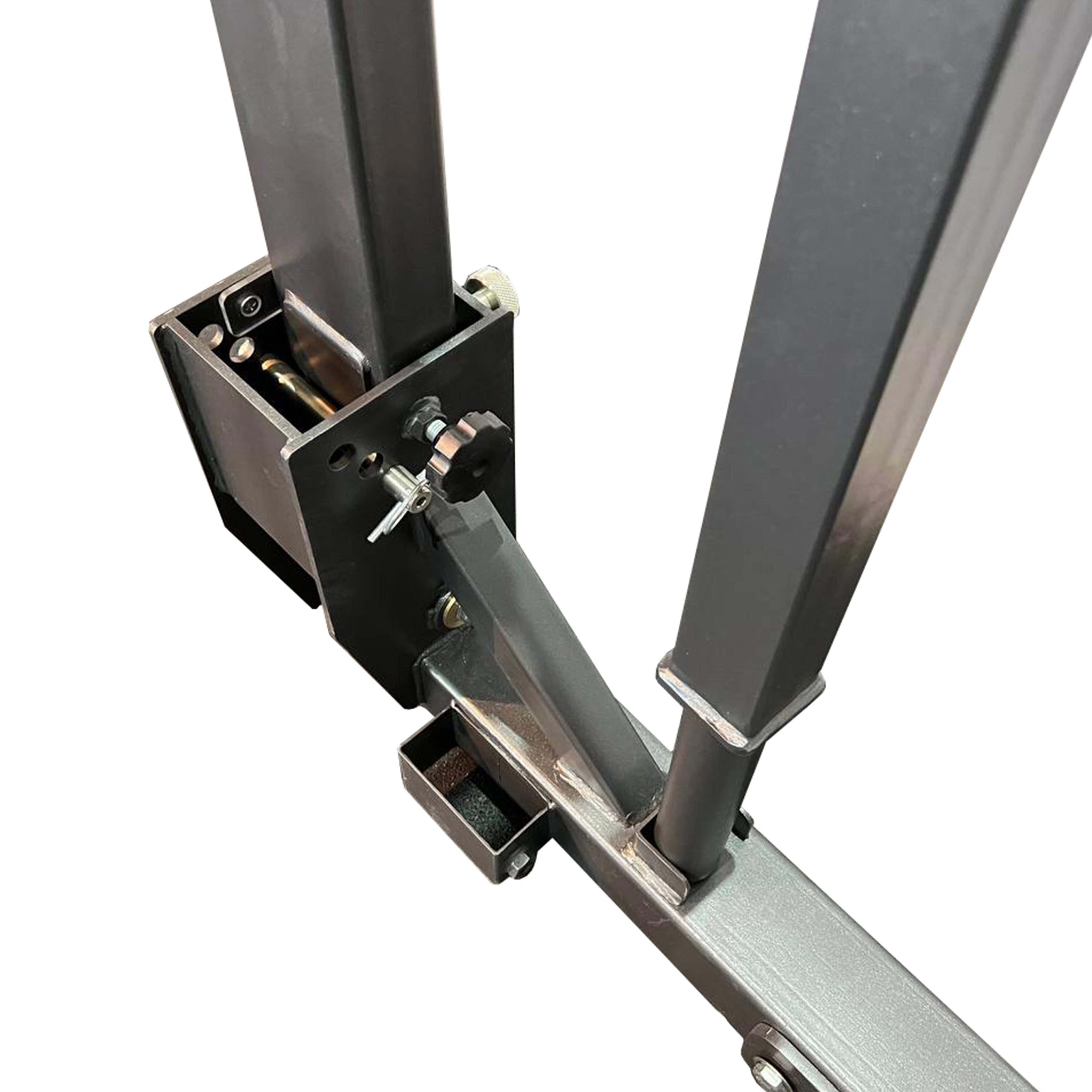 Домкратный рычажный механизм выполнен из труб 50×50×3 мм и Ø42 с толщиной стенки 3 мм и элементами из листового металла толщиной 5 мм. Система рычагов с осевыми шарнирами позволяет плавно изменять высоту положения штанги без снятия грифа, обеспечивая точную настройку под рост спортсмена.