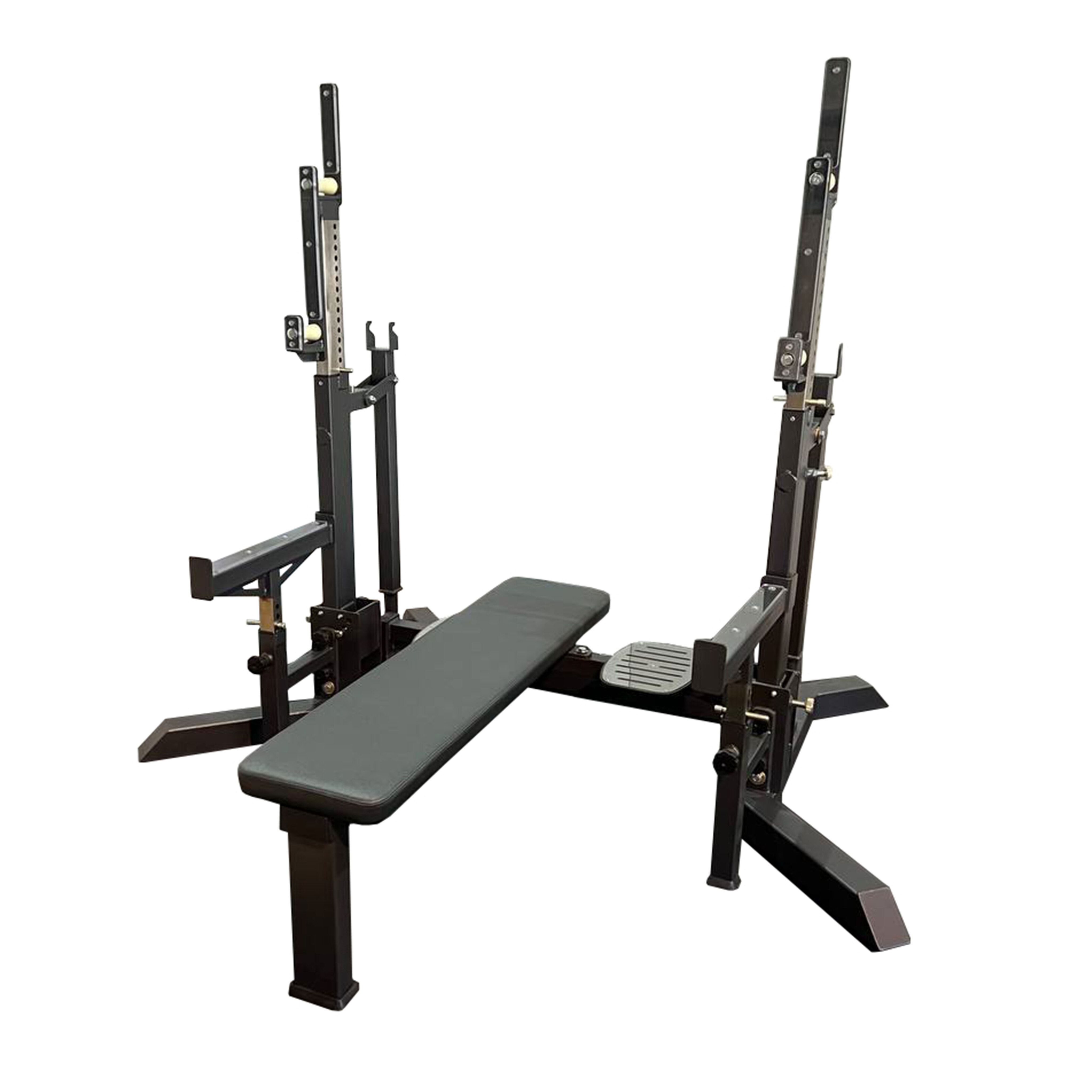 Профессиональный тренажёр для коммерческого использования A3147 предназначен для выполнения упражнений со штангой стоя. Конструкция соответствует требованиям Международной федерации пауэрлифтинга (IPF) и рассчитана на работу с максимальными весами. Домкратный рычажный механизм позволяет быстро изменять высоту положения штанги без её снятия, что обеспечивает удобство и безопасность при проведении силовых тренировок. Стойка имеет конструктивную совместимость с дополнительным модулем – скамьей A3148, который устанавливается при помощи надёжных крепёжных соединений и позволяет выполнять жим лёжа.