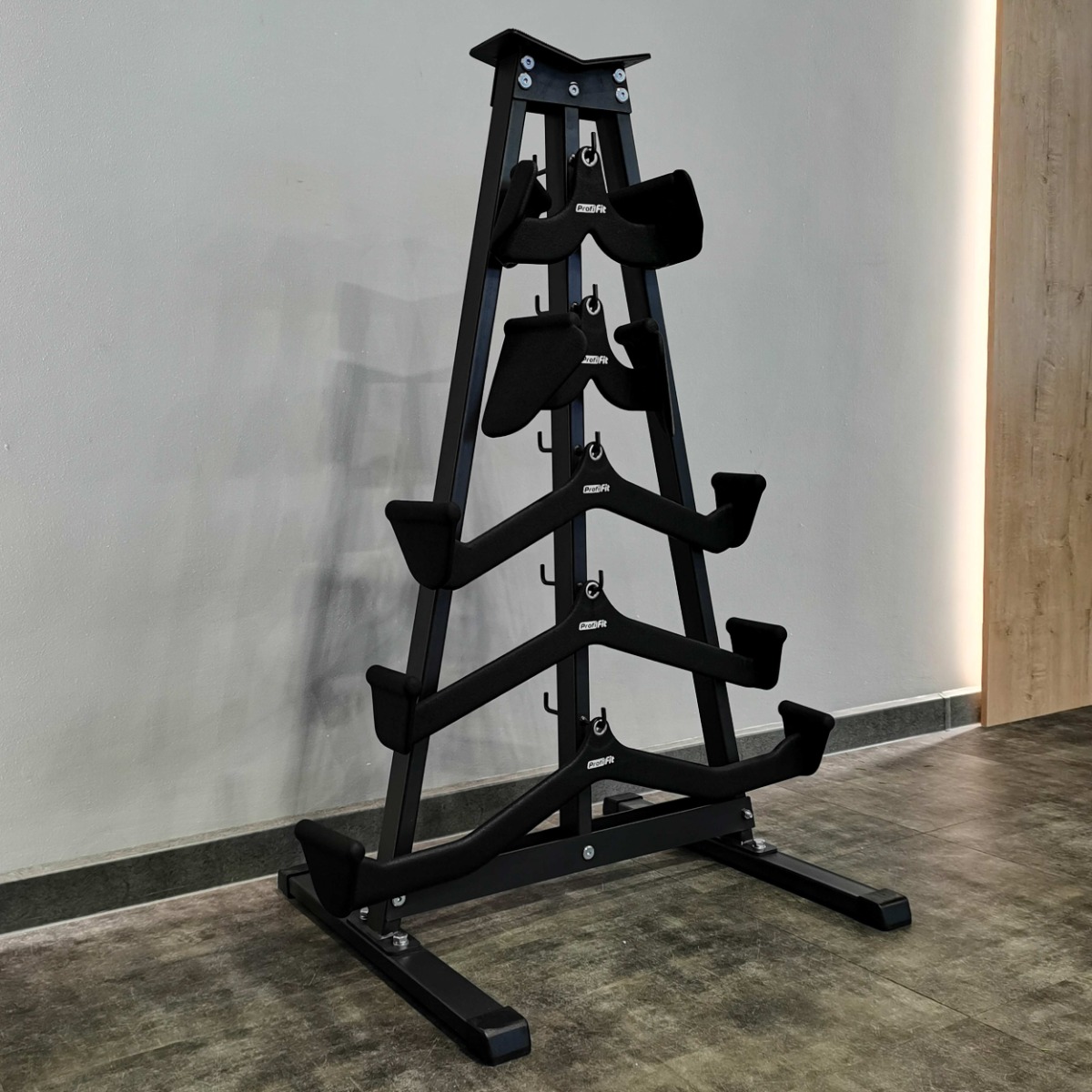 Стойка предназначена для хранения и удобного использования двух комплектов рукояток для блочных тренажеров PROFI-FIT-RT-026. Представляет собой сборную металлическую конструкцию с вертикальными крючками и полочкой для инвентаря.