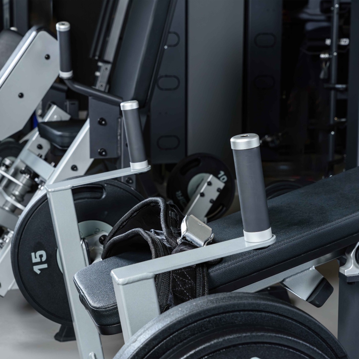 Рукоятки длиной 157 мм (рабочая длина 124 мм) для фиксации тела во время выполнения упражнения и ограничения хода подвижного рычага в верхнем положении выполнены из металлического прутка с нескользящим и неабсорбирующим влагу прорезиненным покрытием.