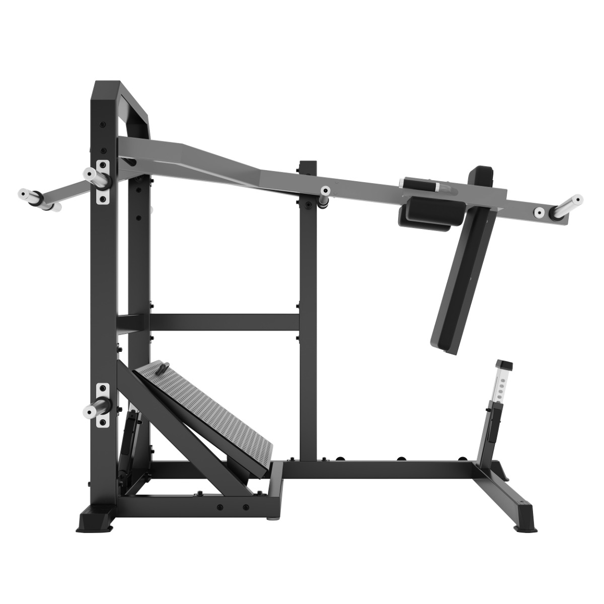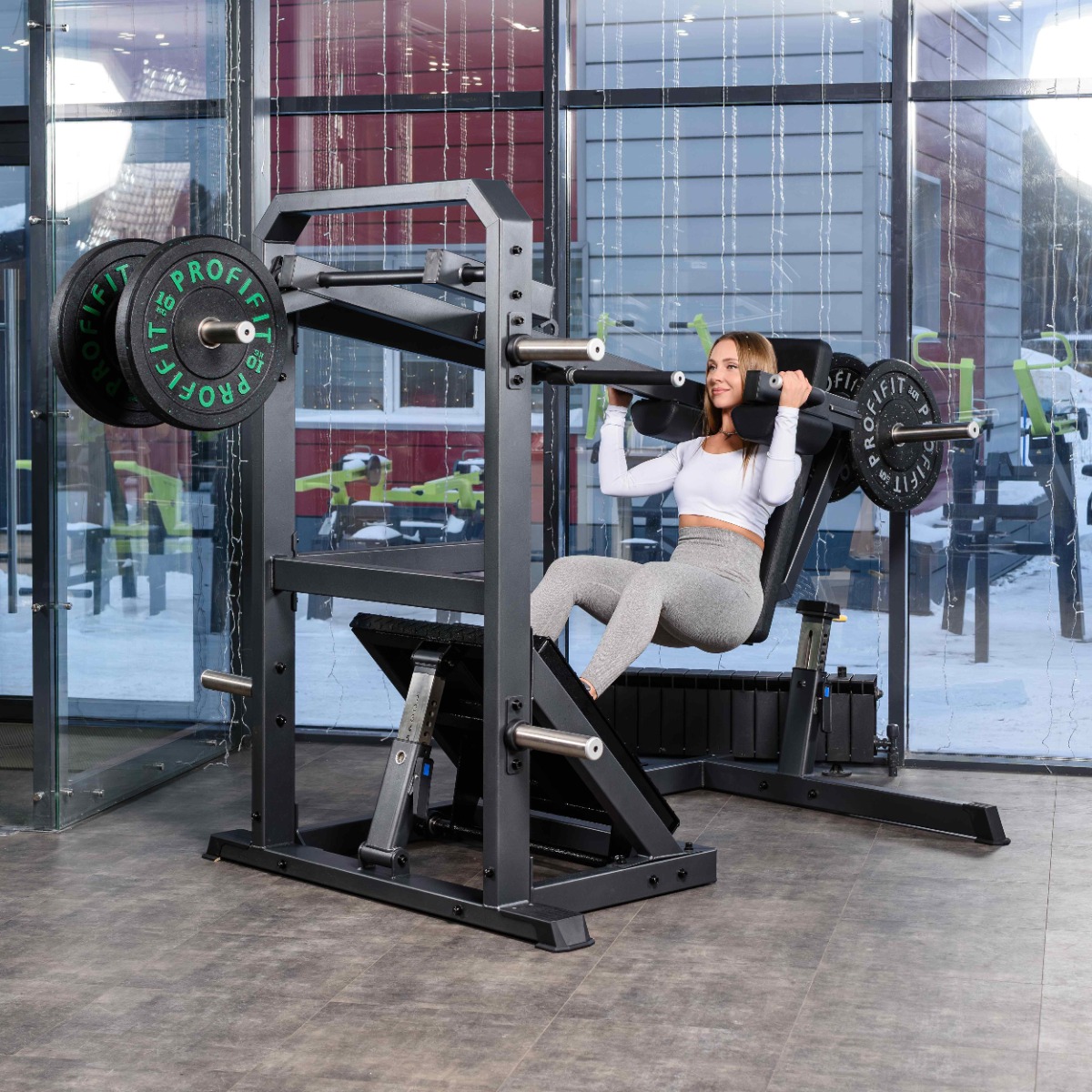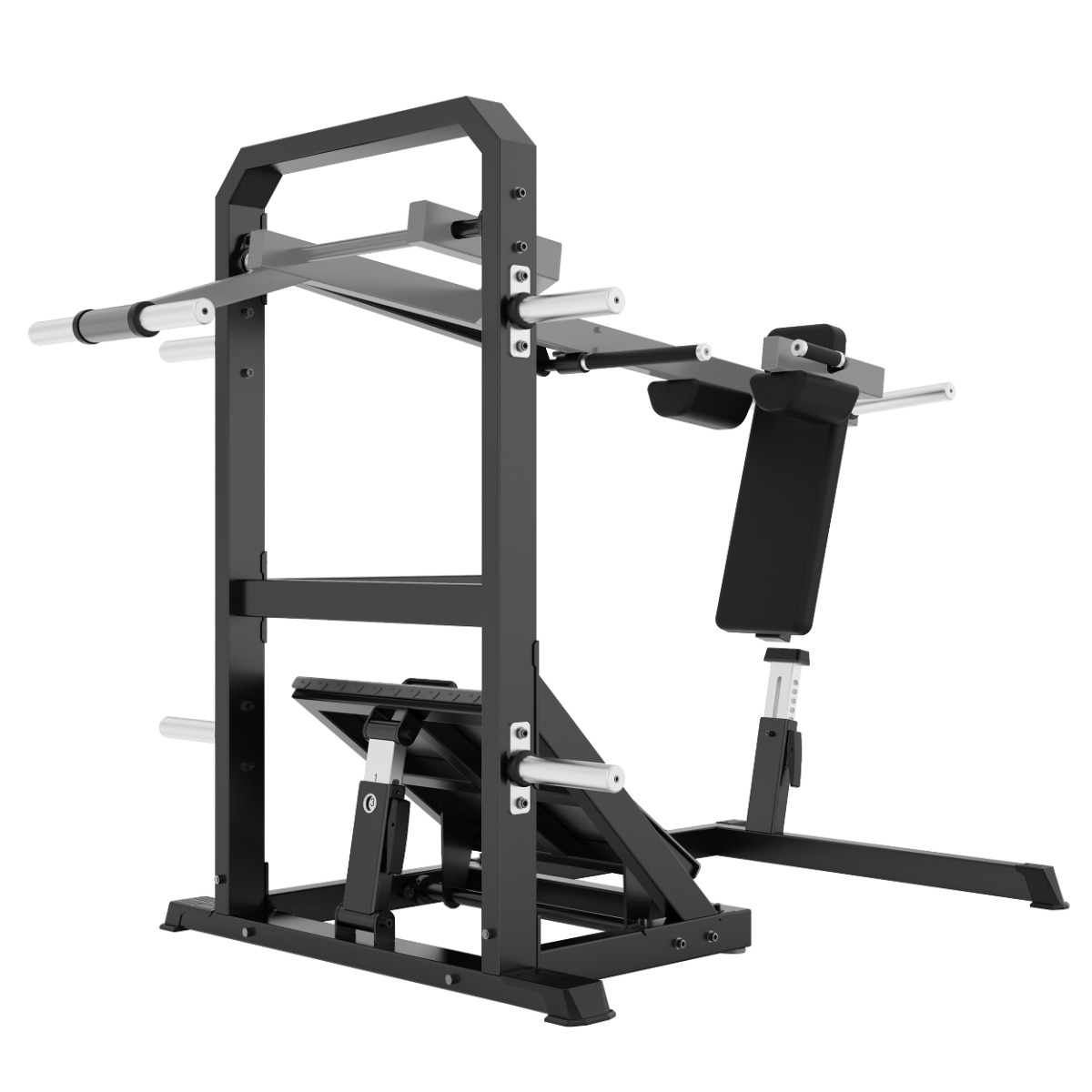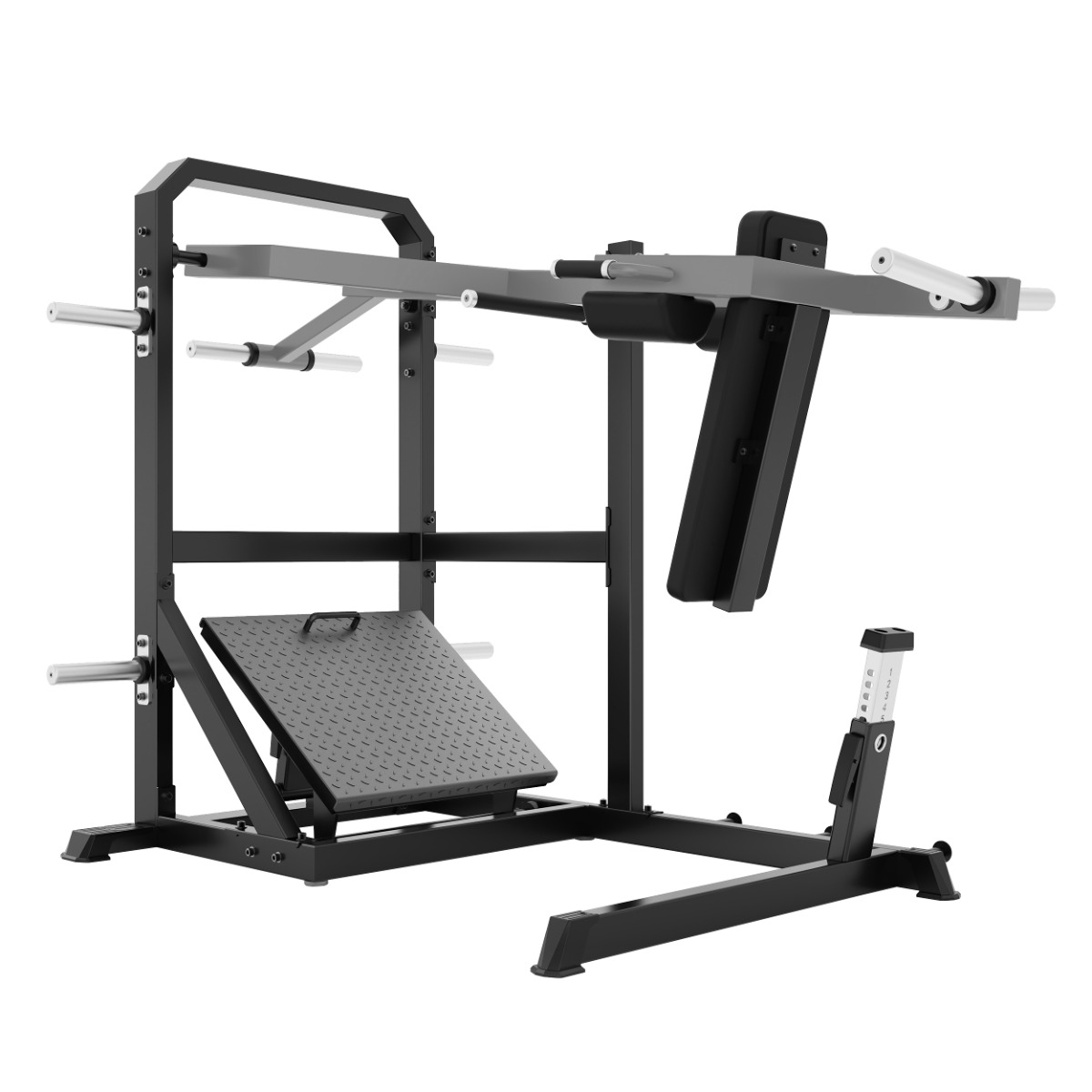 Профессиональный тренажёр для коммерческого использования A610 Маятниковые приседания предназначен для базовой тренировки квадрицепсов, ягодичных мышц и задней поверхности бедра. Маятниковый механизм обеспечивает глубокую амплитуду движения и контролируемую нагрузку, а высокая спинка и подушки под плечи создают устойчивую и безопасную фиксацию корпуса.