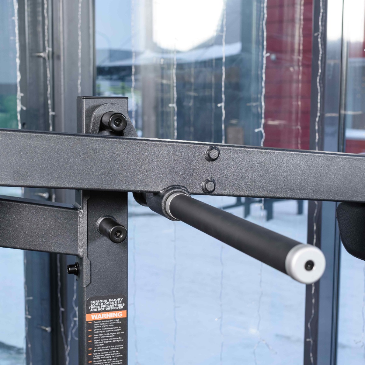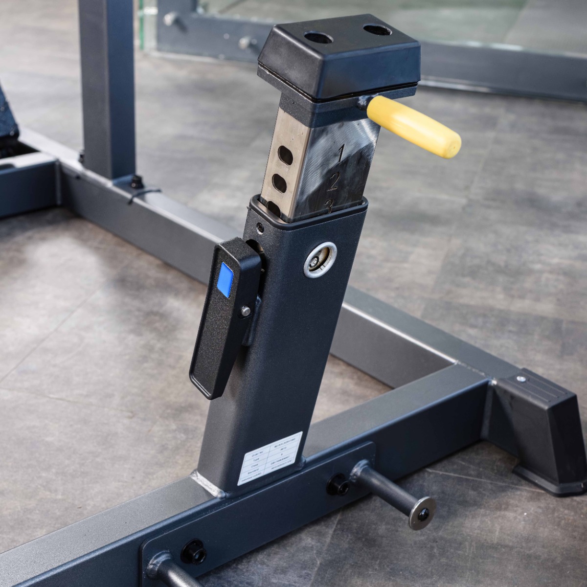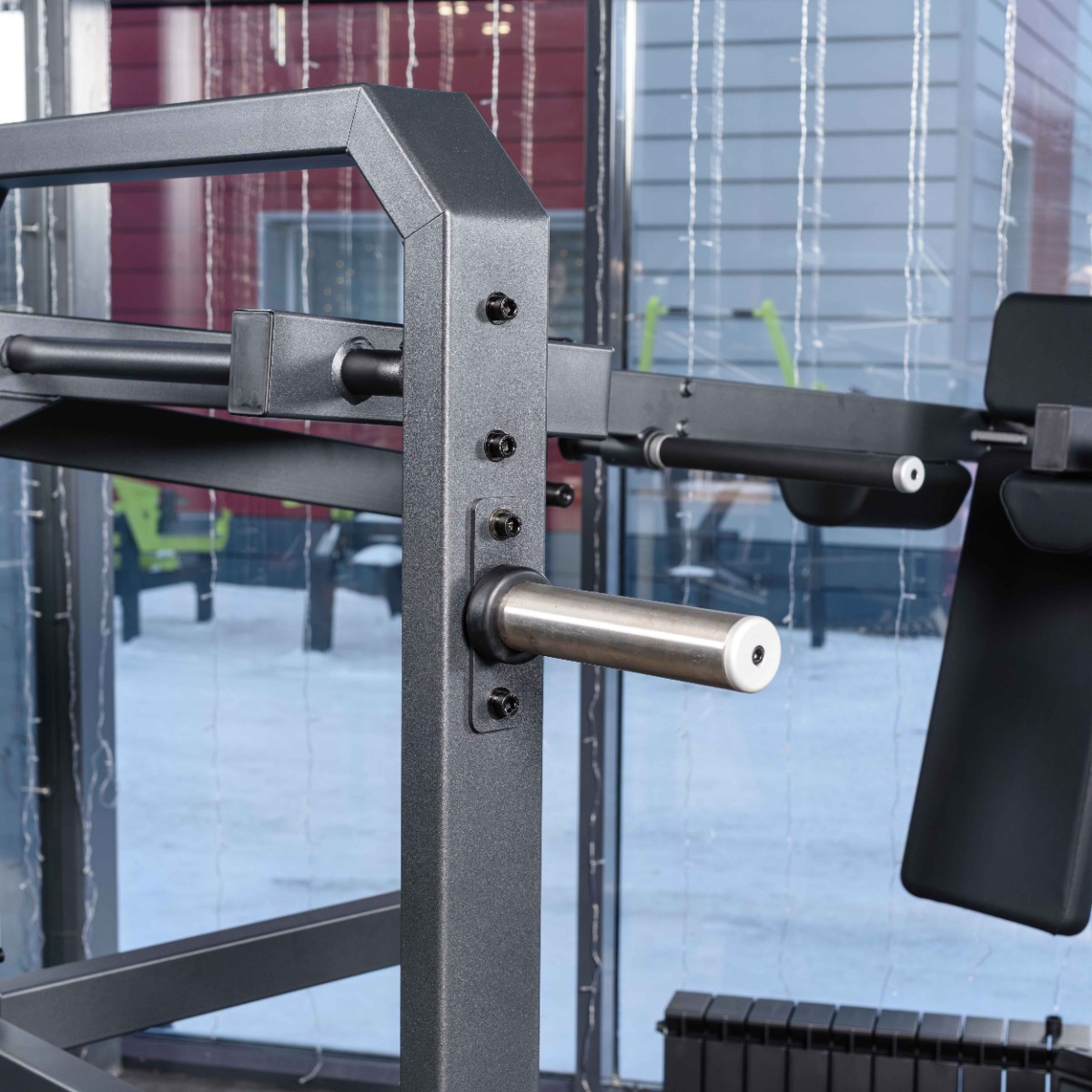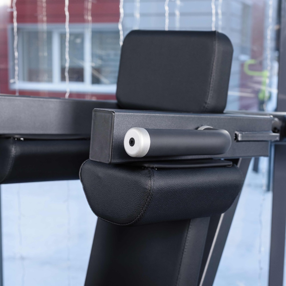 Для безопасного начала и завершения подхода предусмотрен стартовый рычаг, расположенный на уровне подплечников. Стартовый рычаг фиксируется в двух положениях (выше/ниже), удерживает подвижный узел и позволяет пользователю комфортно занять стартовое положение и безопасно завершить упражнение.