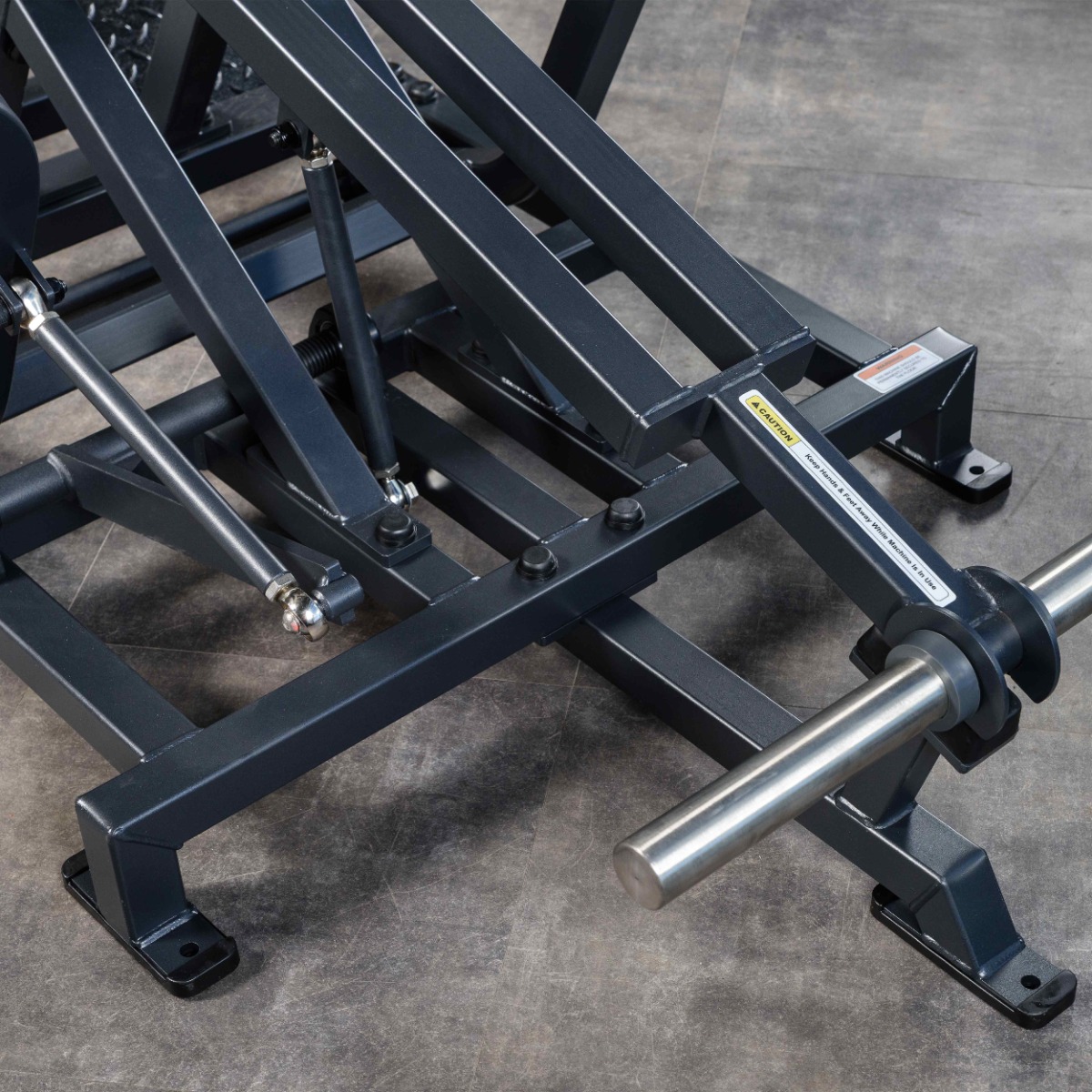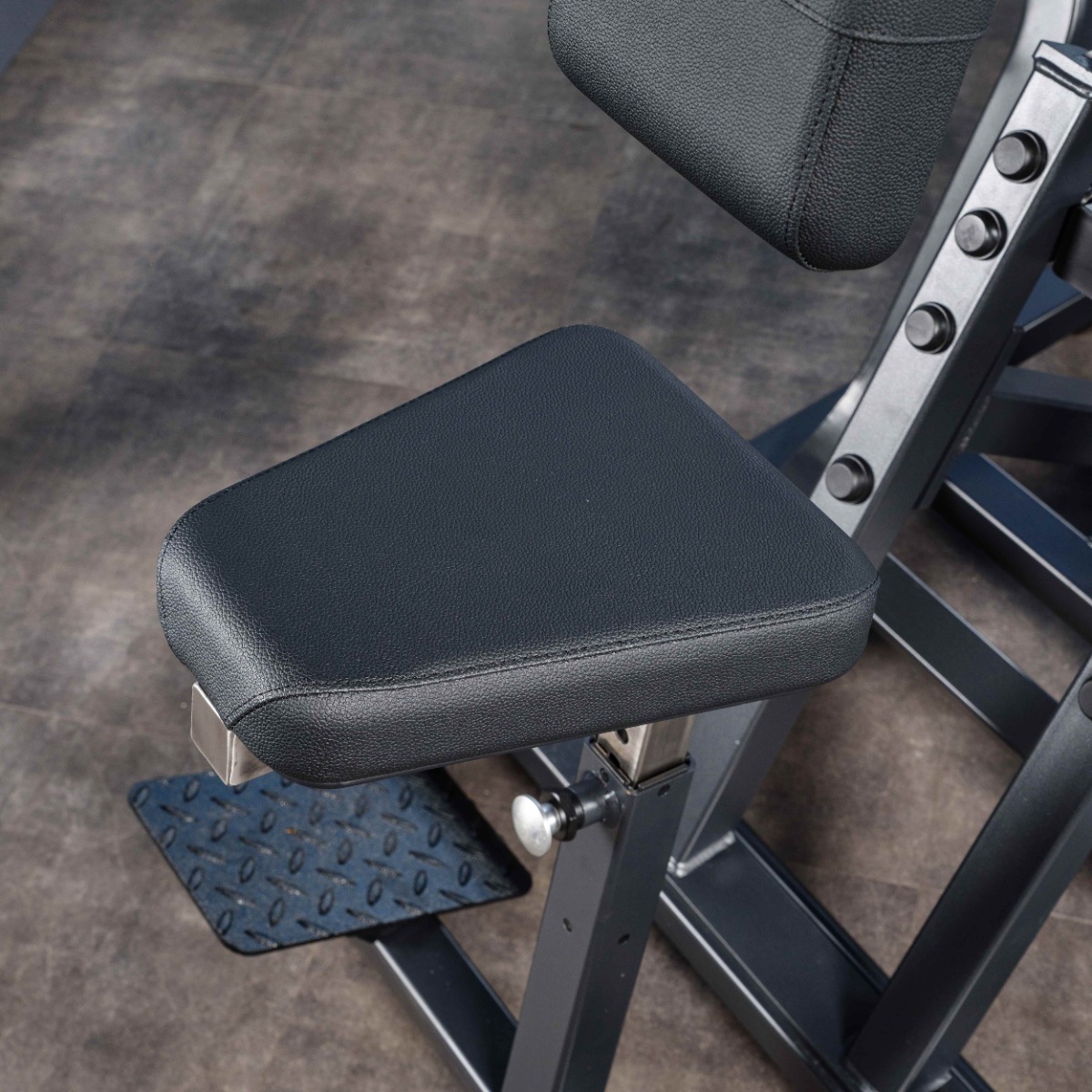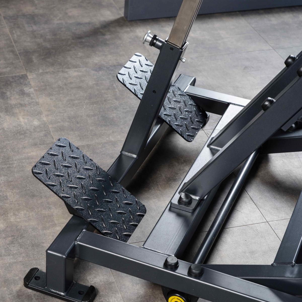 Прямоугольные подпятники из износостойкой резины имеют металлическое основание и отверстия для фиксации к полу. Такая конструкция гарантирует устойчивость тренажёра, равномерное распределение нагрузки и защиту напольного покрытия от повреждений.