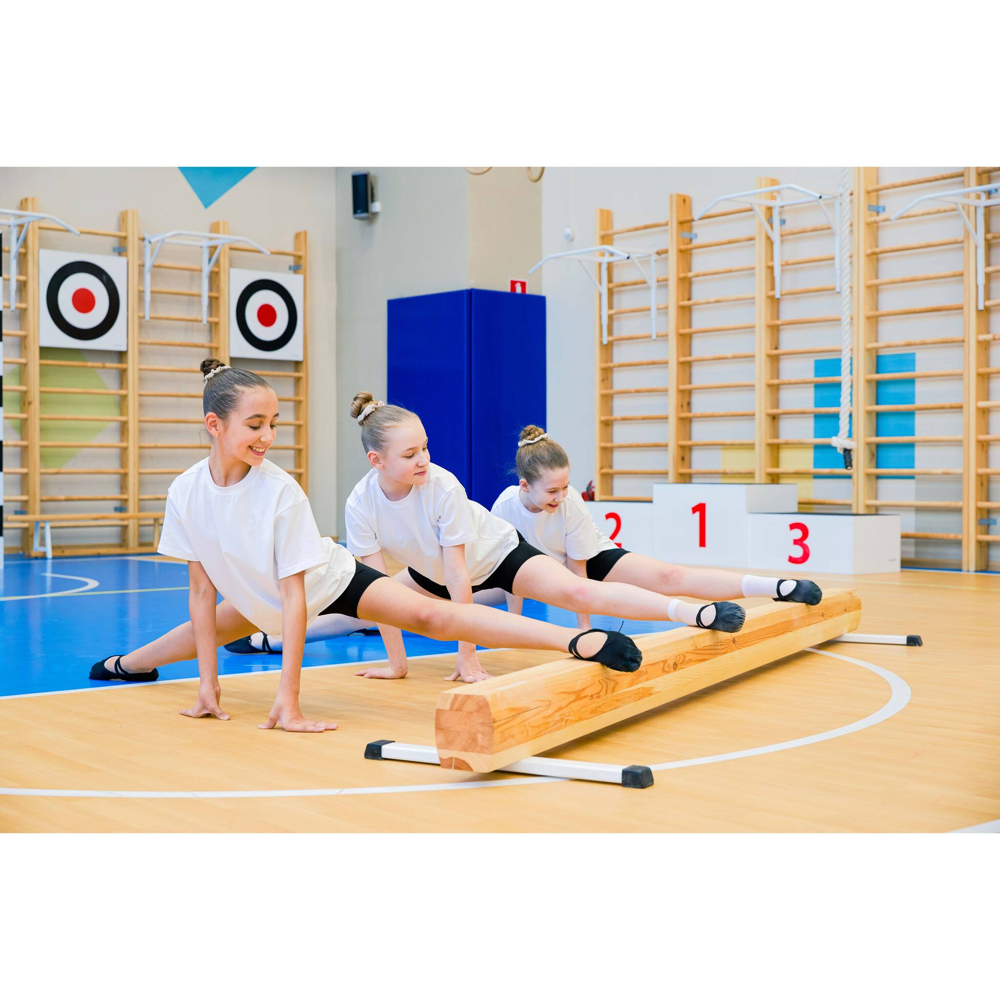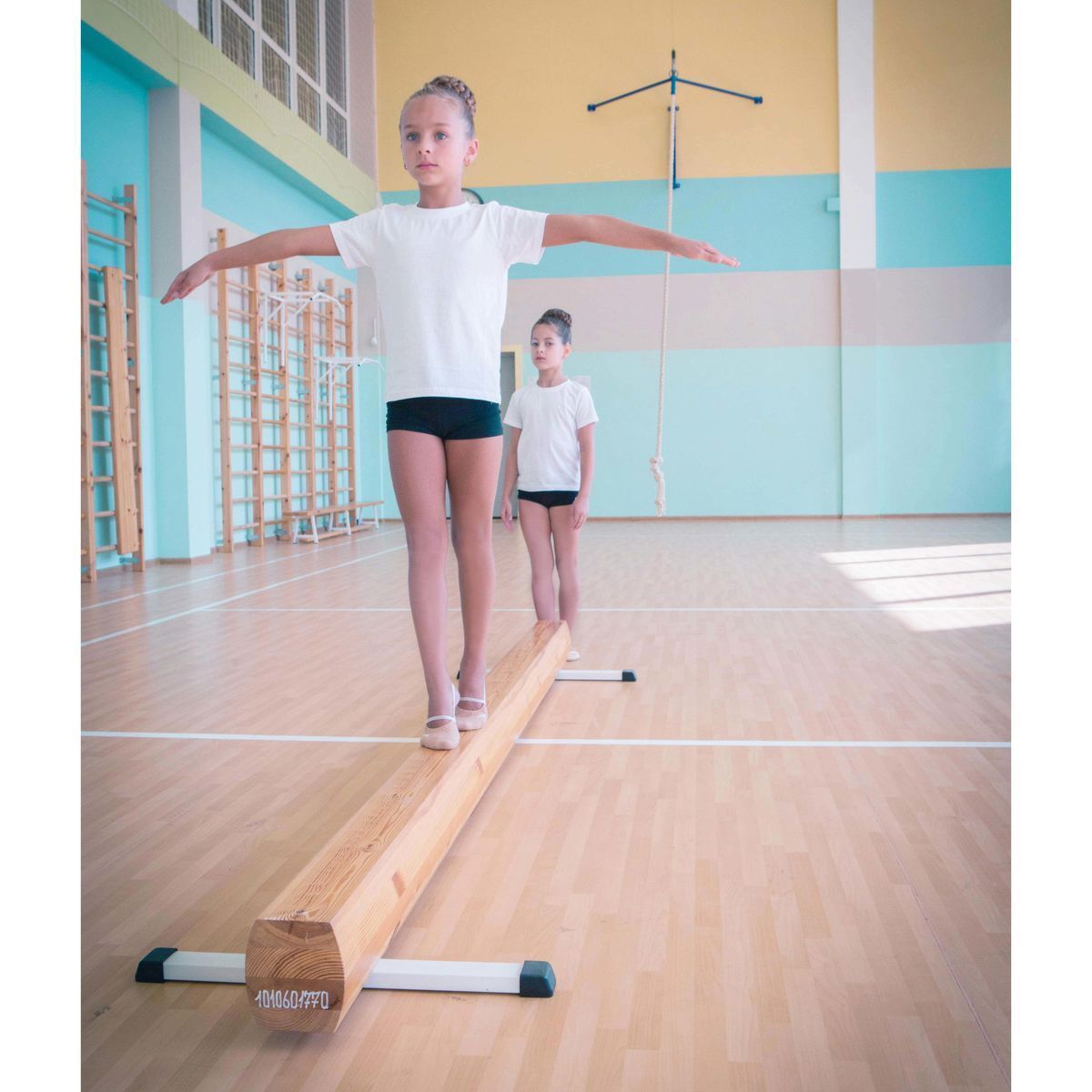 Бревно гимнастическое представляет собой сборную конструкцию, состоящую из бруса и двух нерегулируемых металлических опор, закрепленных к брусу с помощью саморезов.
