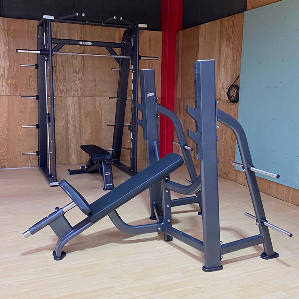 На раме закреплено восемь металлических накопителей для хранения свободных весов, оборудованных кольцами из плотной резины для предотвращения механических повреждений при соприкосновении дисков с рамой.
