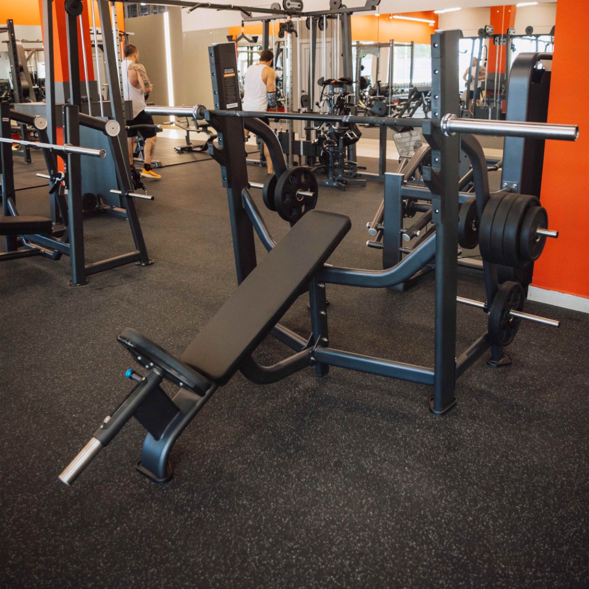 Профессиональный тренажер для коммерческого использования E7042 Скамья-стойка для жима под углом вверх предназначен для проработки больших грудных мышц, передних дельт и трицепсов.
