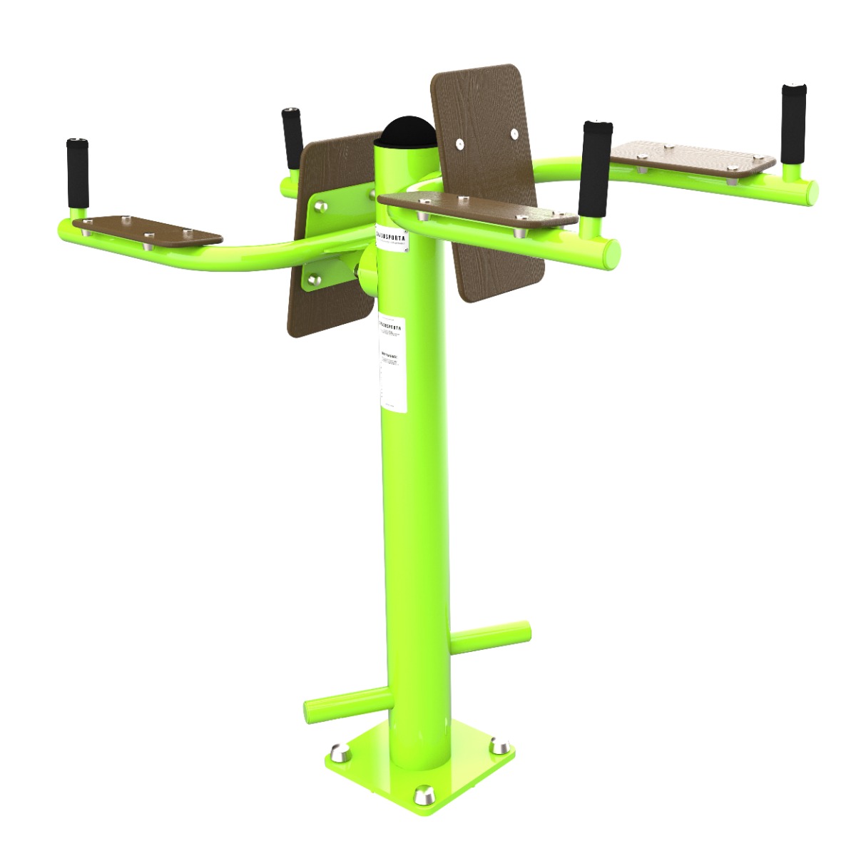 Фланцевое соединение опорного столба с закладной производится через четыре овальных отверстия размером 22×30 мм, расположенных на расстоянии 240 мм. Овальные отверстия под болтовое крепление М16 позволяют дополнительно регулировать положение тренажера. Резьбовые соединения защищены составными металлическими колпачками, входящими в комплект поставки.
