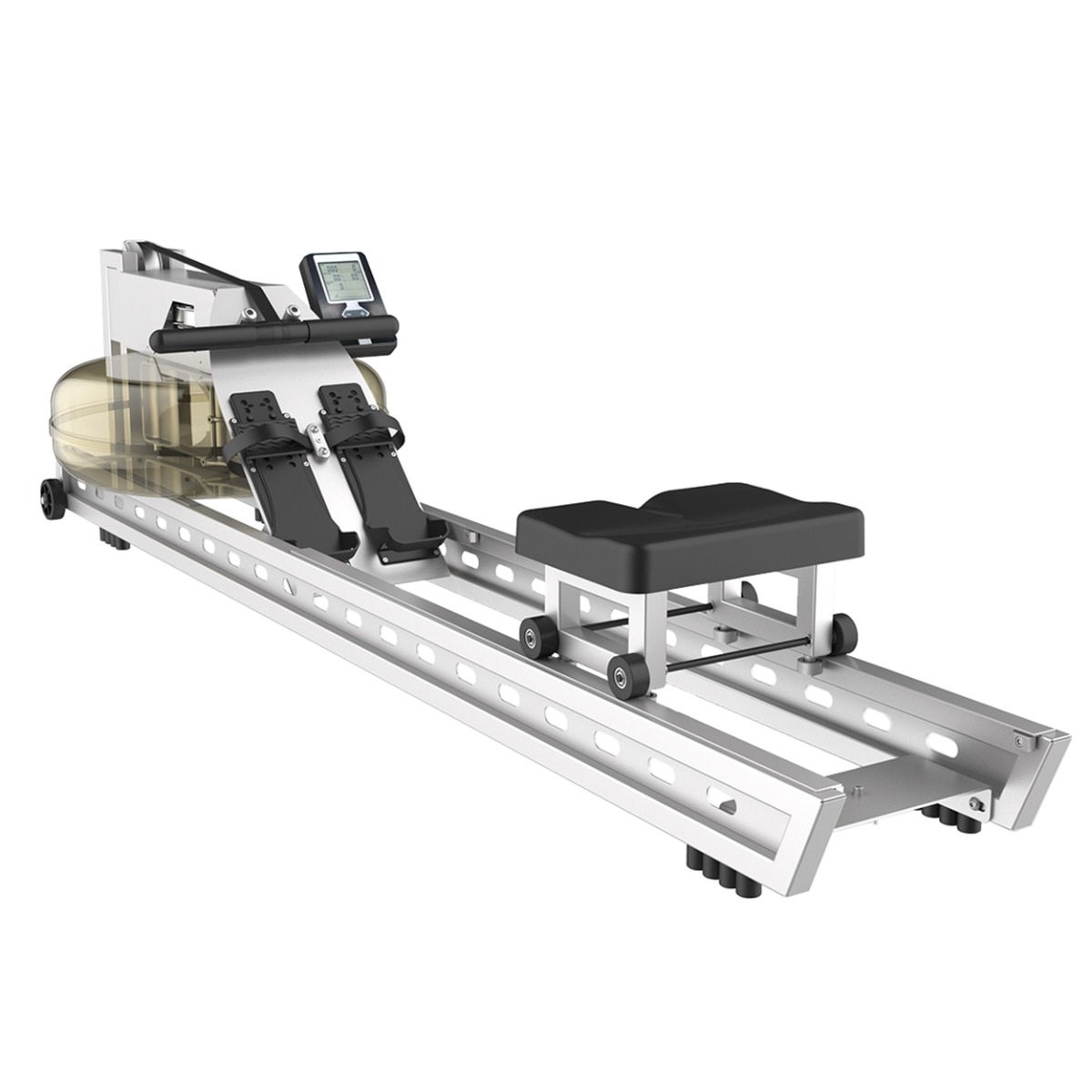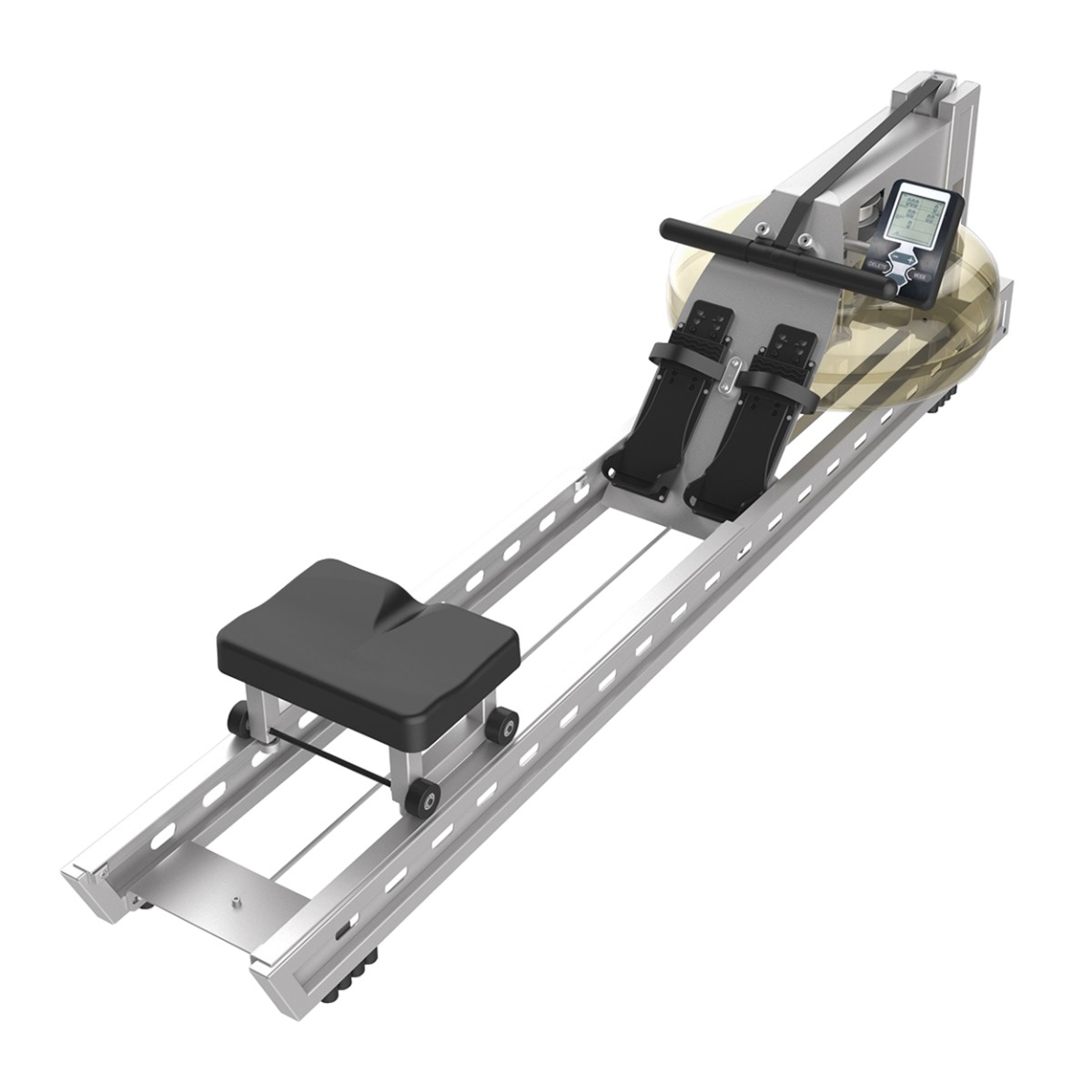Буквенно-цифровой информационный монохромный LCD-дисплей отображает: количество гребков, дистанцию, нагрузку в ваттах, время тренировки, затраченные калории.