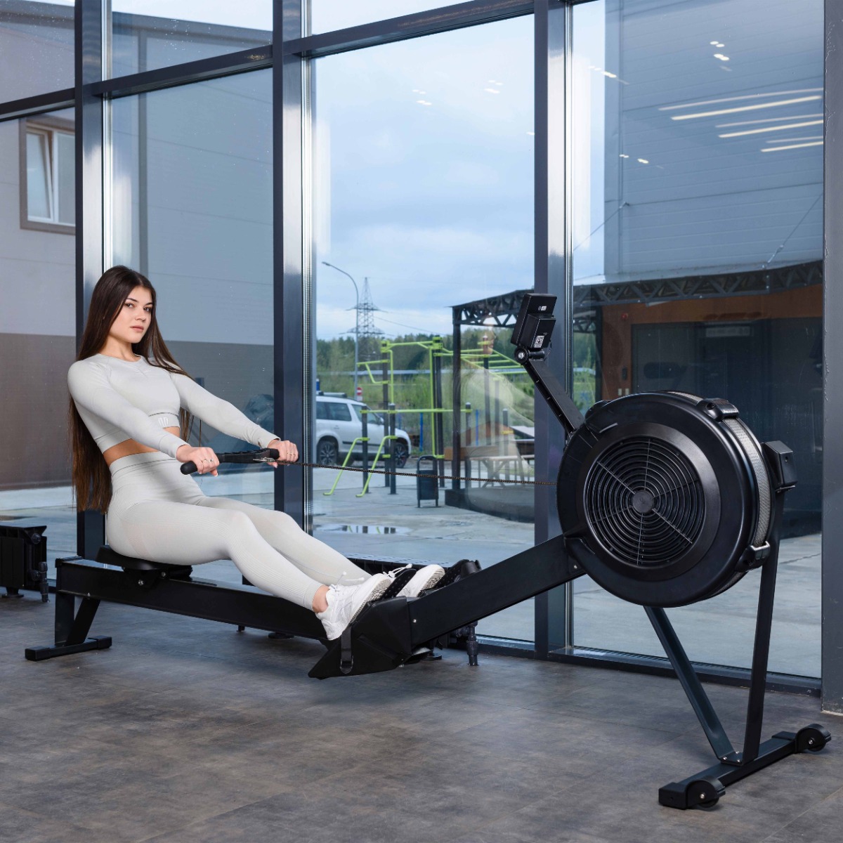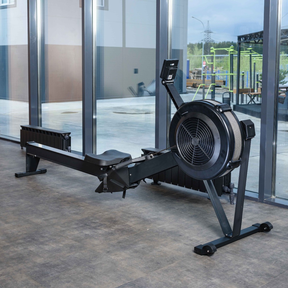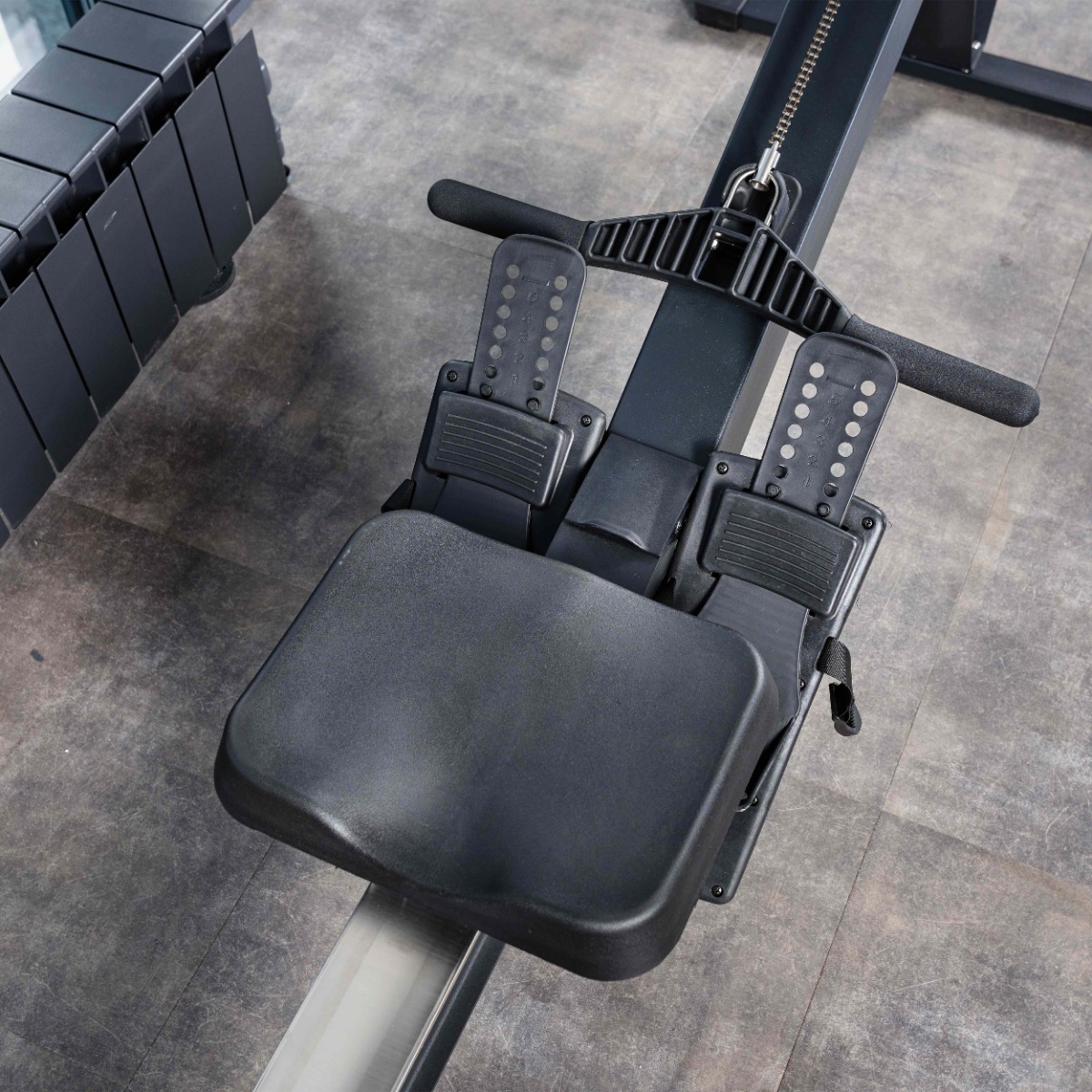 На гребном тренажере установлены прямоугольные пластиковые подпятники и транспортировочные ролики диаметром 40 мм для легкого перемещения.