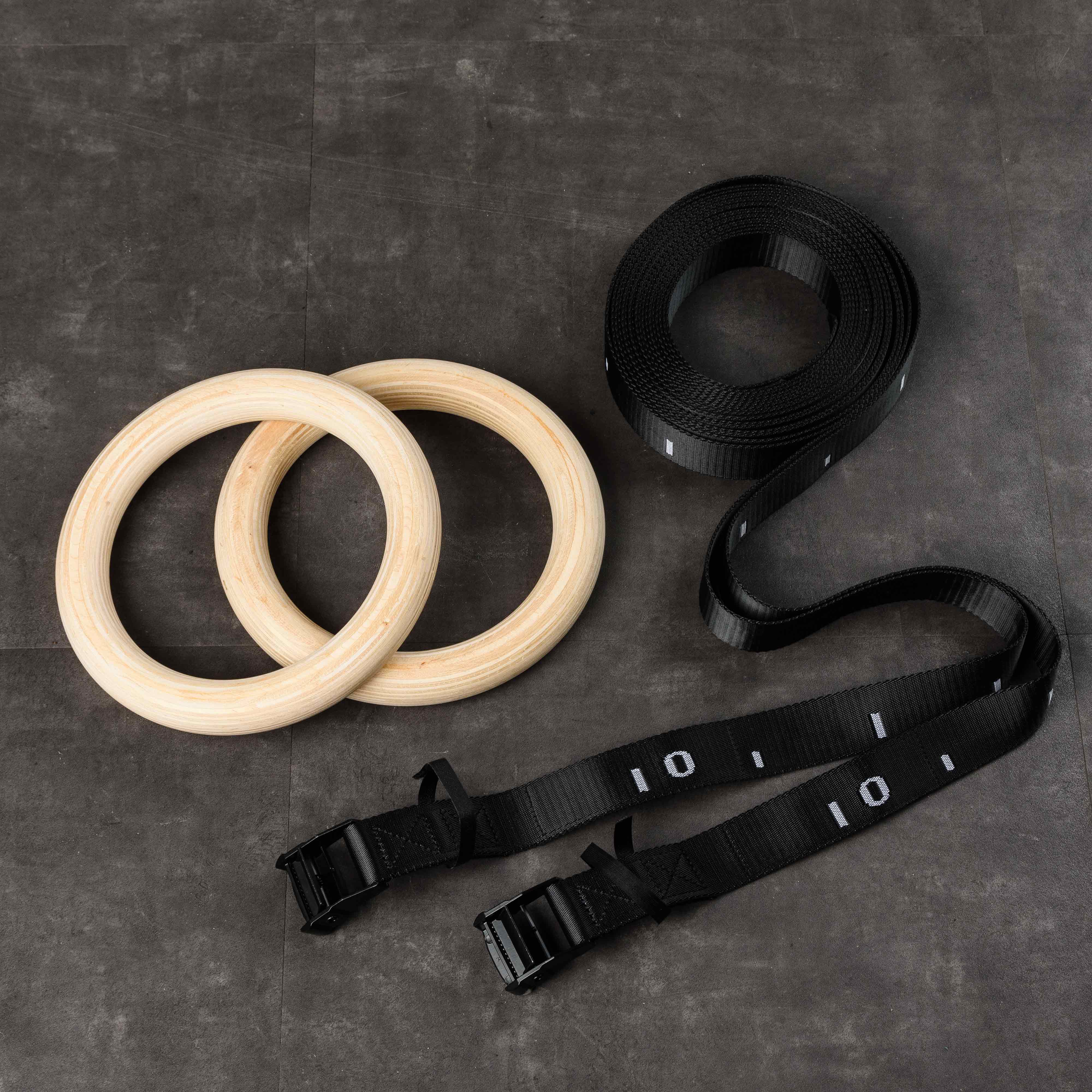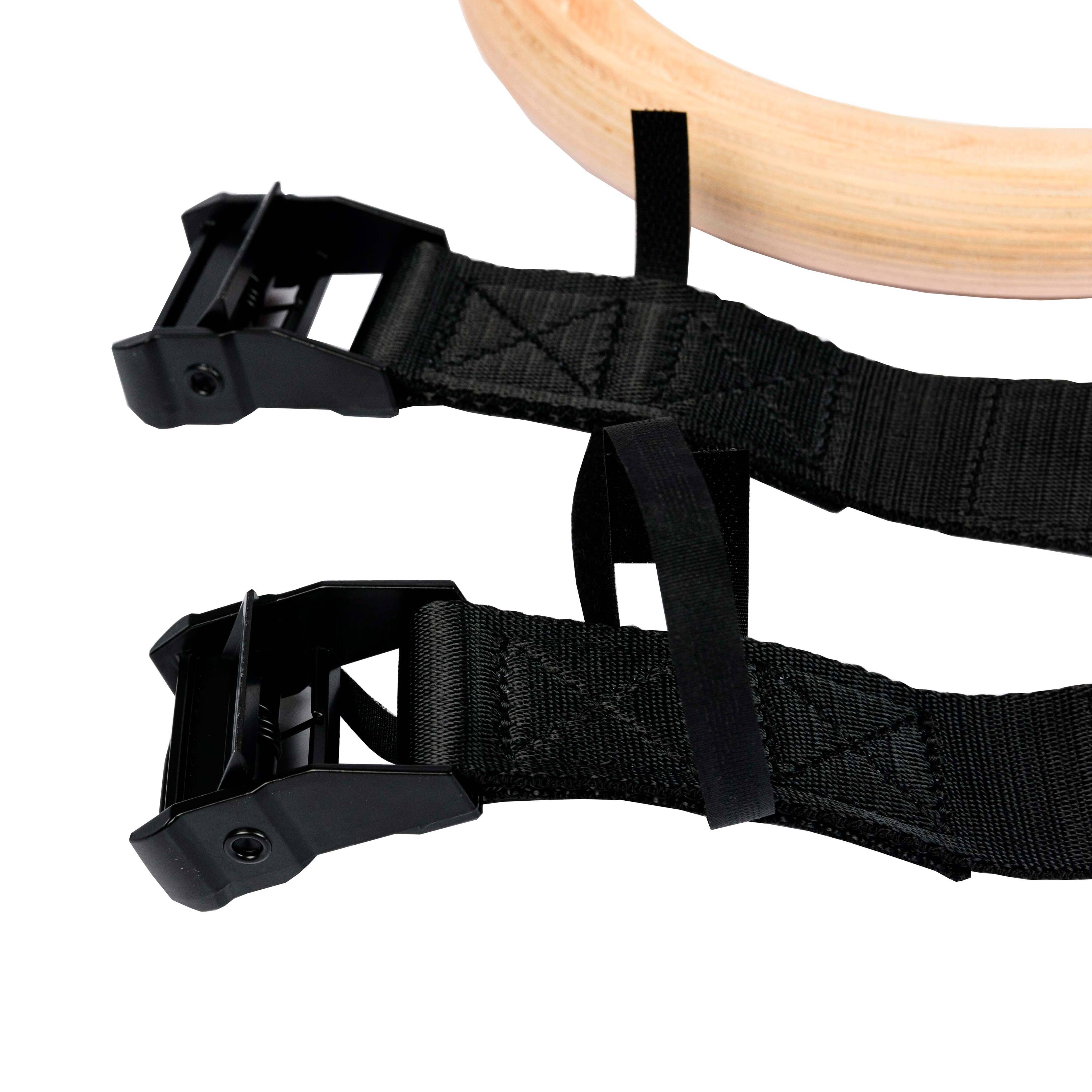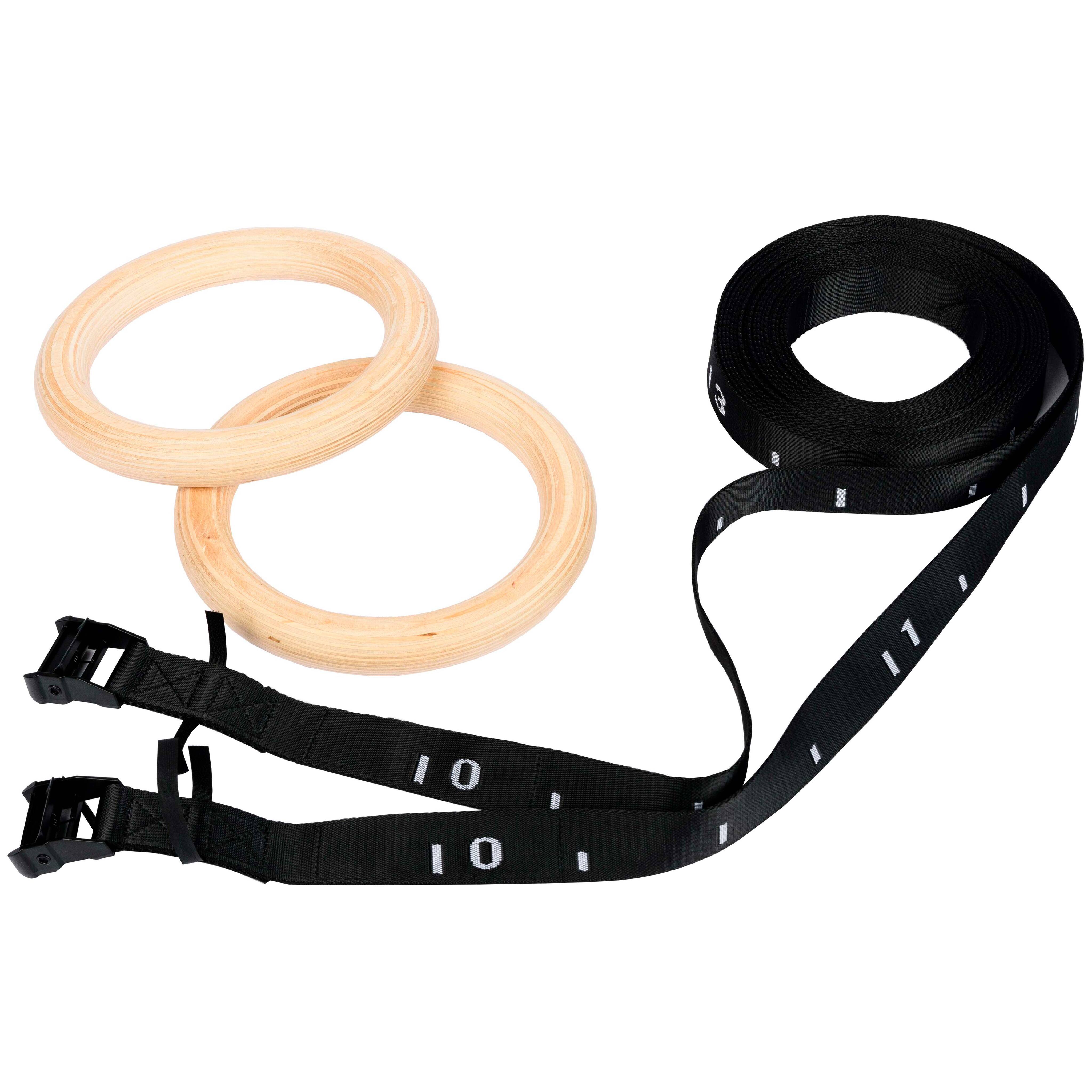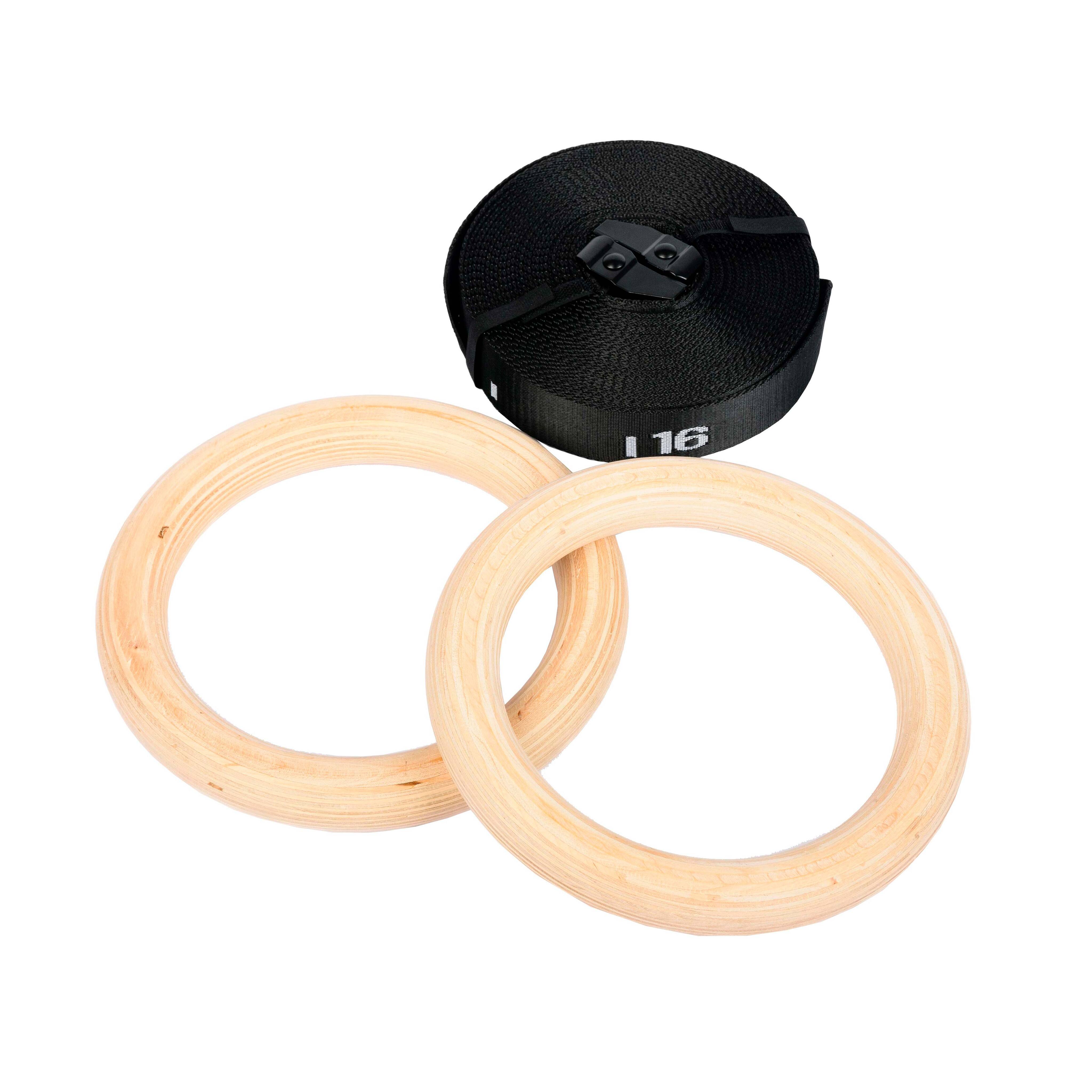 Гимнастические кольца представляют собой пару колец, изготовленных из многослойной фанеры, на которые установлены стропы. Поверхность колец тщательно отшлифована и имеет гладкую поверхность. В комплект входят пряжки пружинные для фиксации стропы.Благодаря удобному способу крепления - специальной системе подвеса, состоящей из прочнейшей стропы (каждая рассчитана на нагрузку в 1 тонну) и пружинного замка с расчетной нагрузкой в 250 кг, снаряд легко регулируется по высоте и просто фиксируется к любой горизонтальной перекладине (турник, детские качели, ветка дерева). Имеют специальный замок, расположенный на ремне для фиксации длины. Кольца хорошо зарекомендовали себя направлениях как Workout, Crossfit и в спортивной гимнастике. Упражнения на этом снаряде развивают мышцы рук, груди, плечевого корпуса и пресса. Тренируют чувство равновесия, выносливость, координацию.