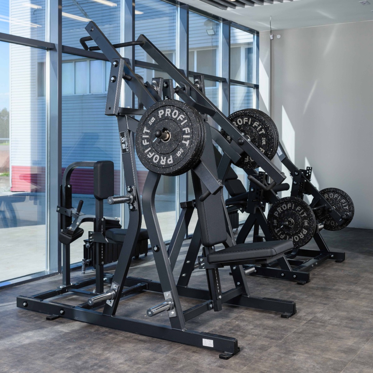 Количество хромированных накопителей для хранения свободных весов: 6 штук из толстостенной стальной трубы диаметром 48 мм. Максимальный вес на накопитель: 100 кг.