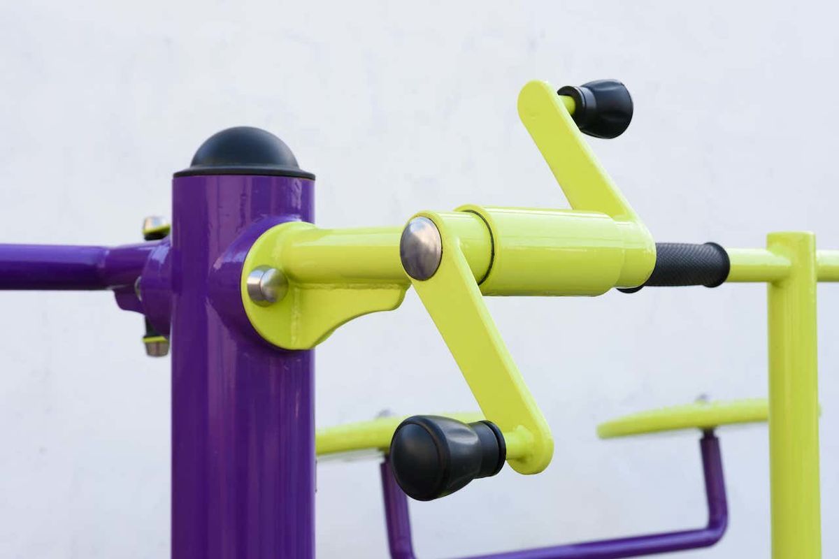 Механизм ограничения амплитуды движения с фиксированным углом хода предотвращает чрезмерное отклонение рабочих рычагов, исключая возможность травмирования пользователя и снижая ударные нагрузки на конструкцию. Дополнительно выполняет функцию антивандальной защиты, исключая контакт подвижных элементов между собой.