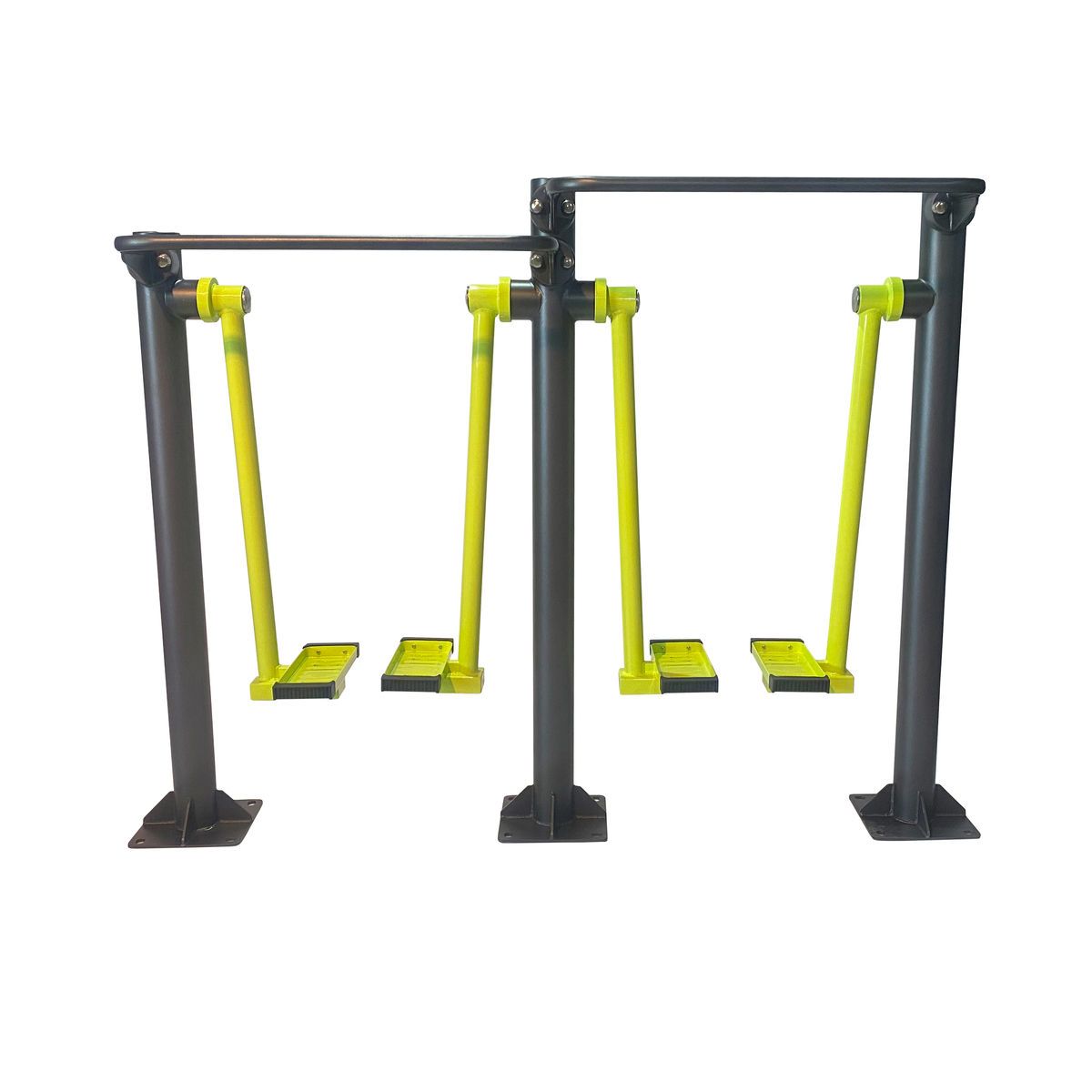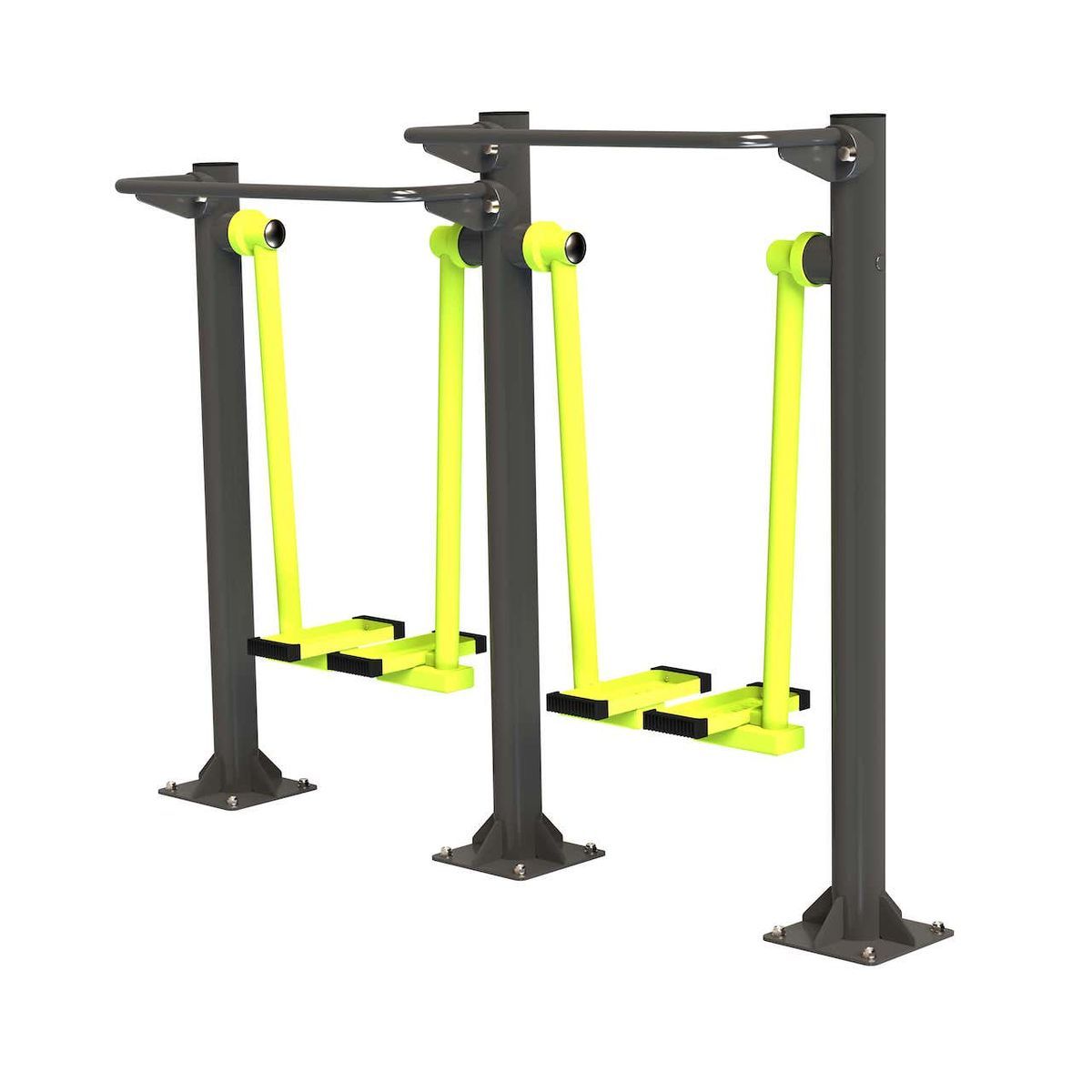 Оборудование состоит из опорных столбов, рычагов с опорными площадками под стопы, рукоятей и закладных. Закладные монтируются в грунт и заливаются бетоном. Опорные столбы крепятся к закладным за счет фланцевого соединения и отсыпаются песчано-гравийной смесью до уровня площадки. Фланцевое крепление позволяет надёжно смонтировать оборудование и беспрепятственно демонтировать при необходимости обслуживания. Монтажные схемы прилагаются к комплекту поставки.