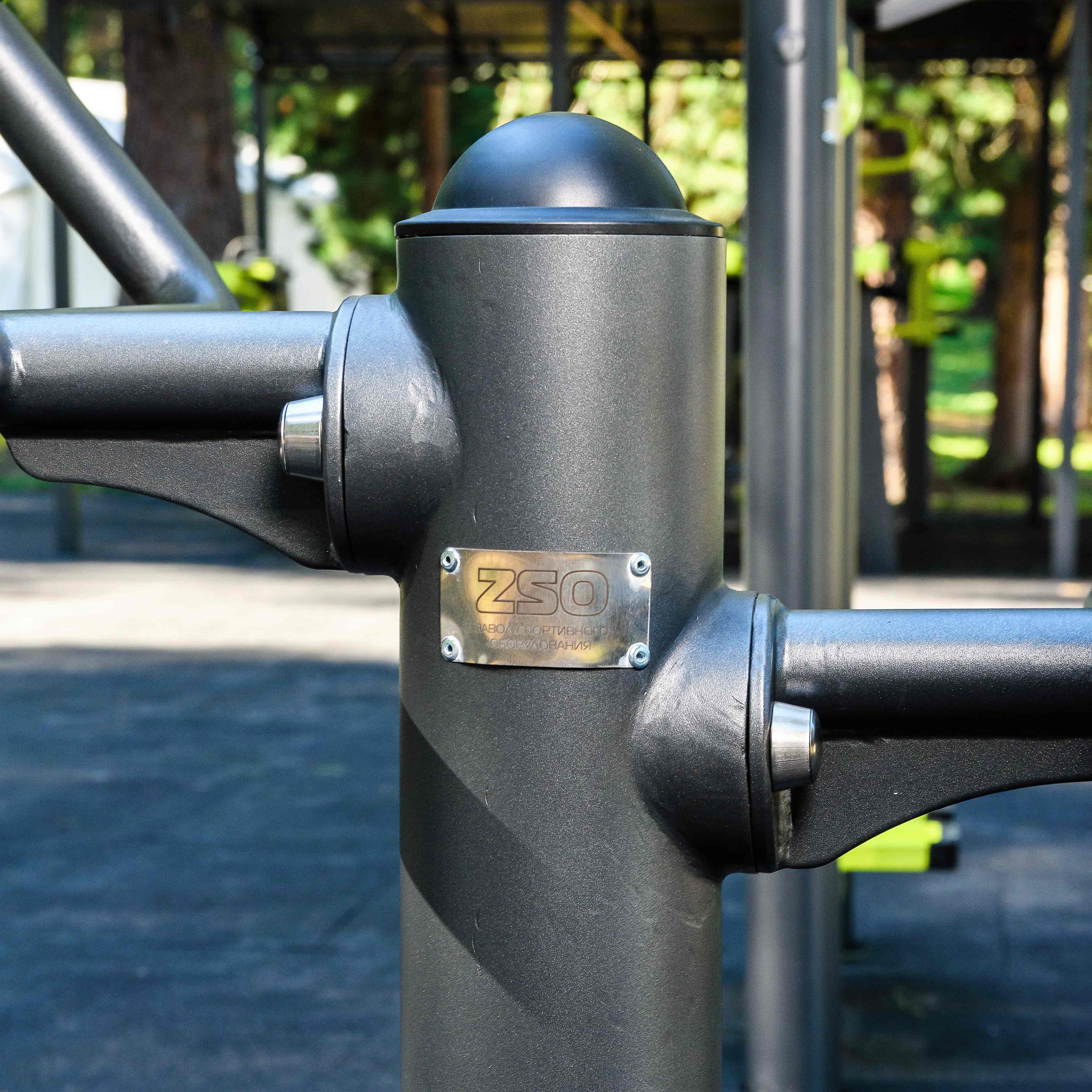 Фланцевое соединение опорного столба с закладной производится через четыре овальных отверстия размером 22×30 мм, расположенных на расстоянии 240 мм. Овальные отверстия под болтовое крепление М16 позволяют дополнительно регулировать положение тренажера. Резьбовые соединения защищены составными металлическими колпачками, входящими в комплект поставки.