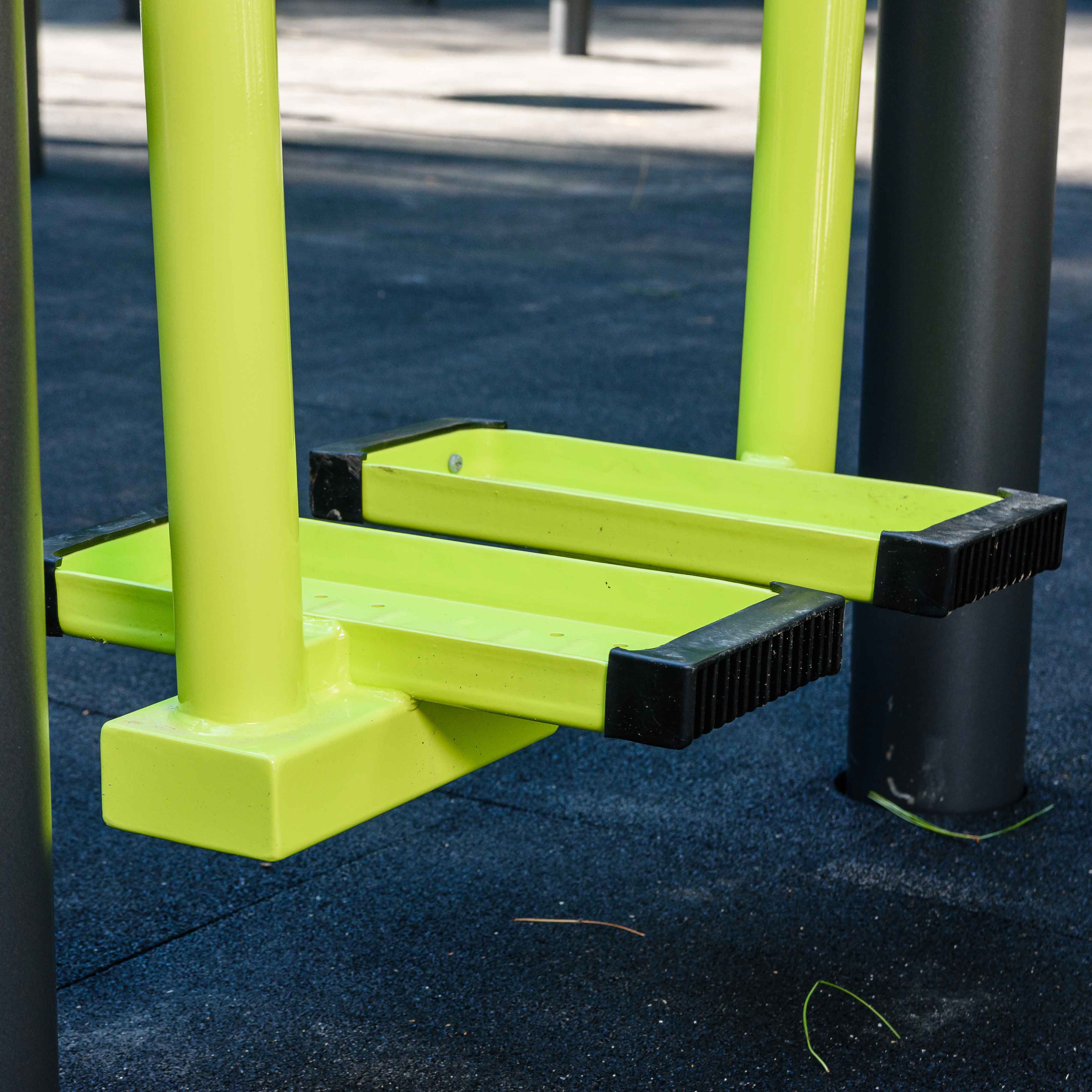 Опорные площадки для стоп 395×150×40 мм с буртиком 21 мм и радиусом перехода 9 мм выполнены из стального штампованного листа толщиной 4 мм для обеспечения необходимой жесткости и прочности. Не имеют сварных швов. Каждая опорная площадка оборудована парными резиновыми накладками для обеспечения безопасности во время тренировки.
