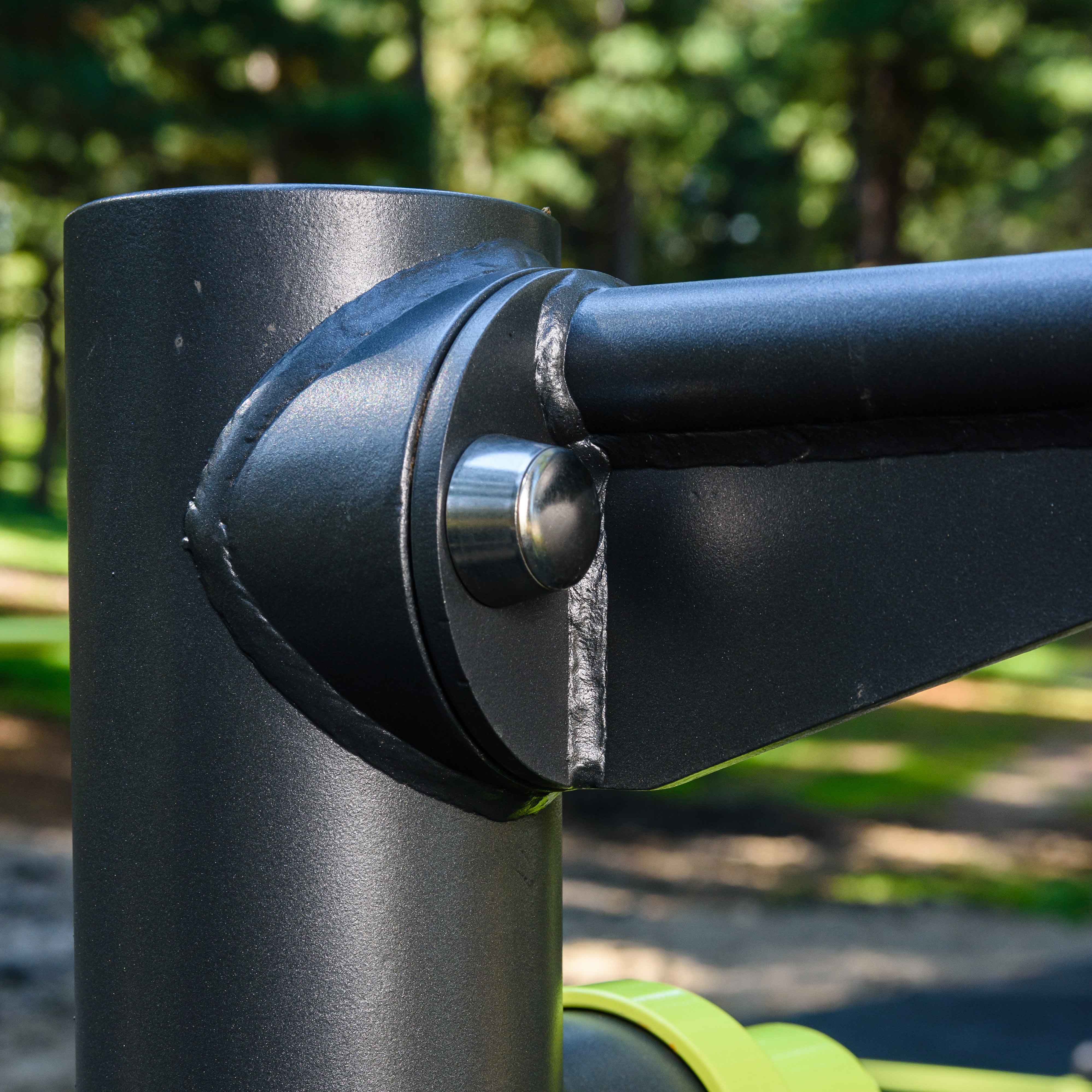 Фланцевое соединение опорного столба с закладной производится через четыре овальных отверстия размером 22×30 мм, расположенных на расстоянии 240 мм. Овальные отверстия под болтовое крепление М16 позволяют дополнительно регулировать положение тренажера. Резьбовые соединения защищены составными металлическими колпачками, входящими в комплект поставки.