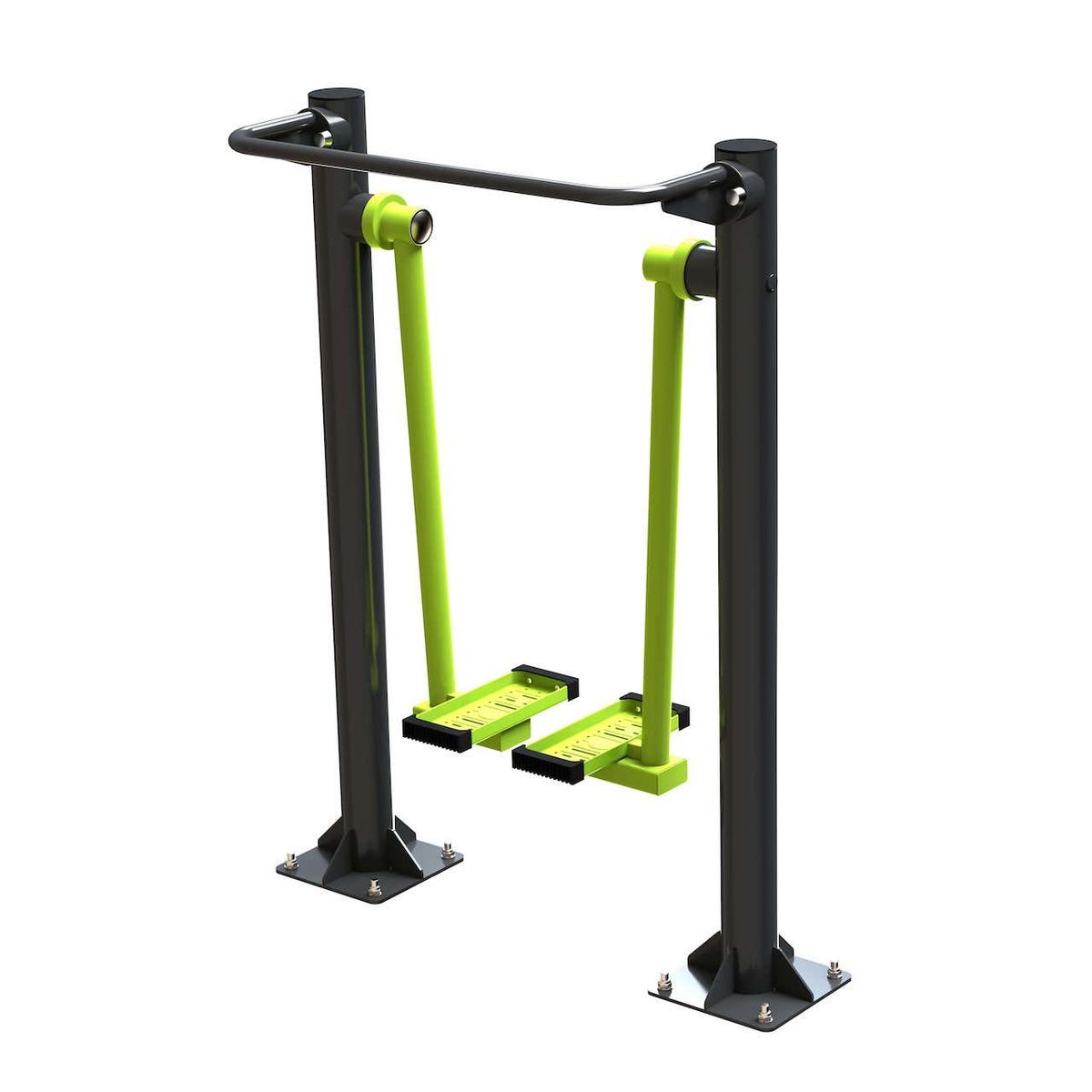 Оборудование состоит из опорных столбов, рычагов с опорными площадками под стопы, рукояти и закладных. Закладные монтируются в грунт и заливаются бетоном. Опорные столбы крепятся к закладным за счет фланцевого соединения и отсыпаются песчано-гравийной смесью до уровня площадки. Фланцевое крепление позволяет надёжно смонтировать оборудование и беспрепятственно демонтировать при необходимости обслуживания. Монтажные схемы прилагаются к комплекту поставки.