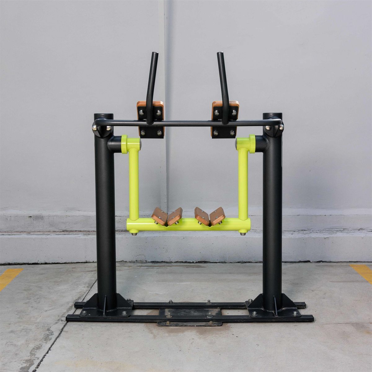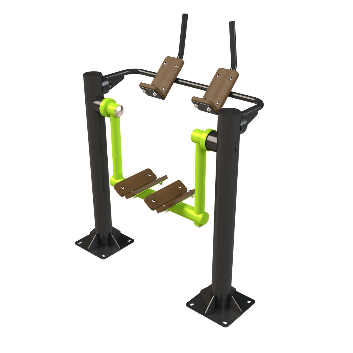 Оборудование состоит из опорных столбов, рычага с опорами для ног, рукояти и закладных. Закладные монтируются в грунт и заливаются бетоном. Опорные столбы крепятся к закладным за счет фланцевого соединения и отсыпаются песчано-гравийной смесью до уровня площадки. Фланцевое крепление позволяет надёжно смонтировать оборудование и беспрепятственно демонтировать при необходимости обслуживания. Монтажные схемы прилагаются к комплекту поставки.