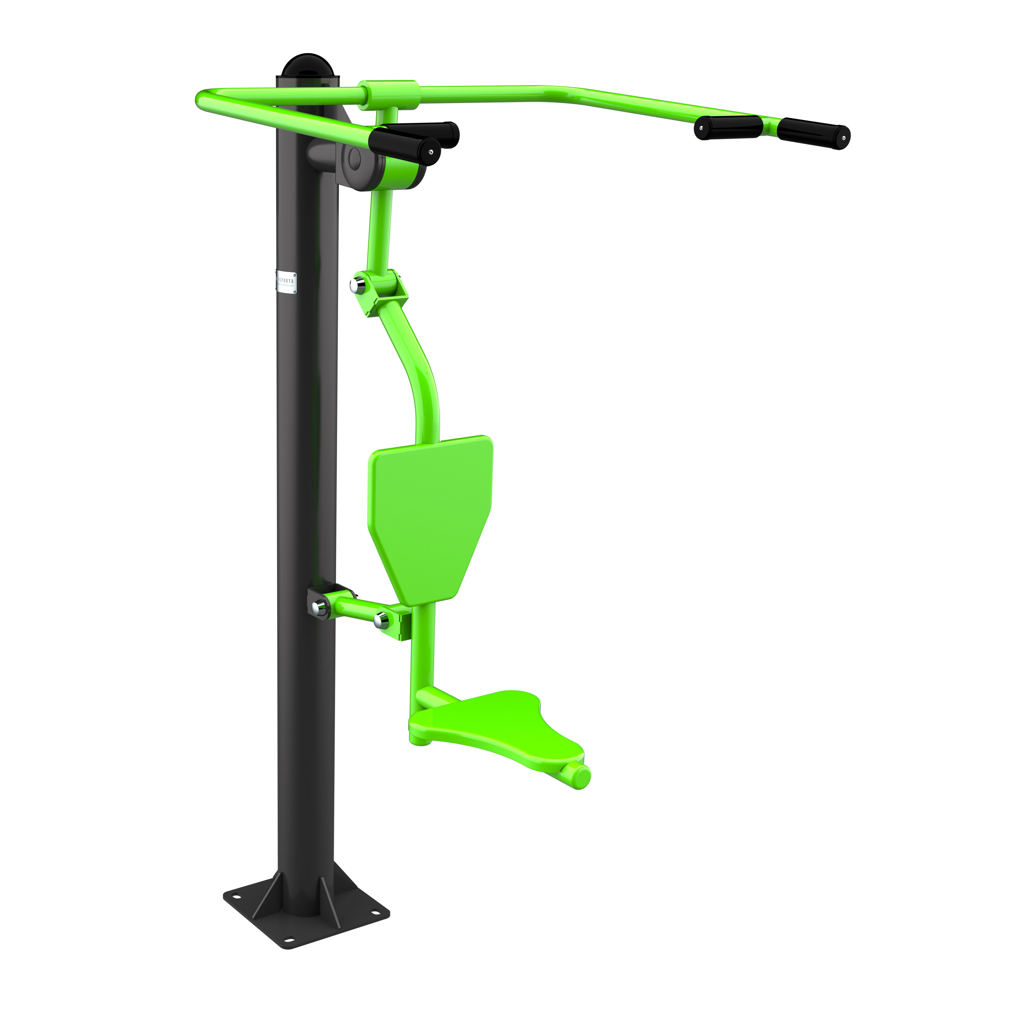 Оборудование состоит из опорного столба, рычага с сиденьем и спинкой, рычага с рукоятями и закладной. Закладная монтируется в грунт и заливается бетоном. Опорный столб крепится к закладной за счет фланцевого соединения и отсыпается песчано-гравийной смесью до уровня площадки. Фланцевое крепление позволяет надёжно смонтировать оборудование и беспрепятственно демонтировать при необходимости обслуживания. Монтажные схемы прилагаются к комплекту поставки.