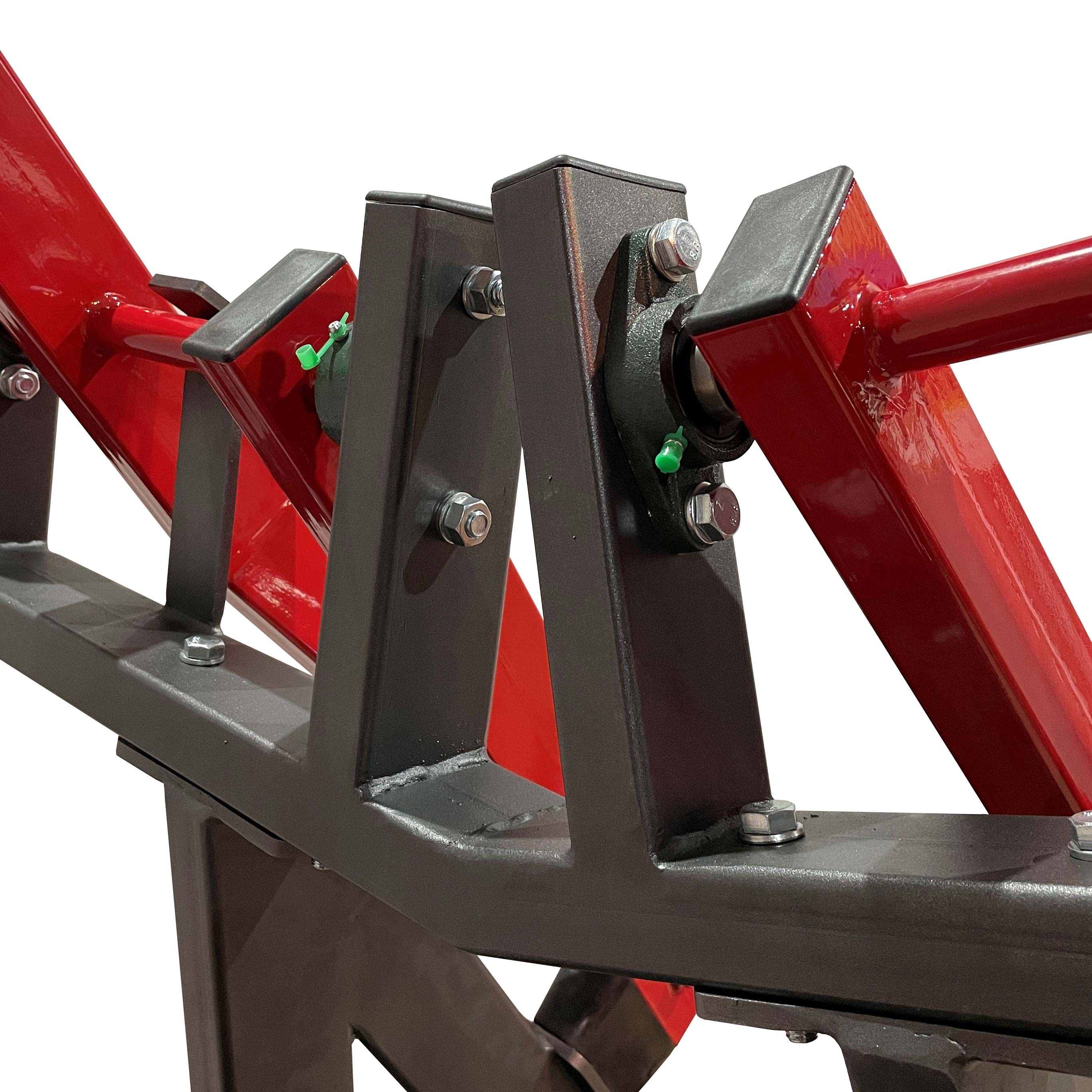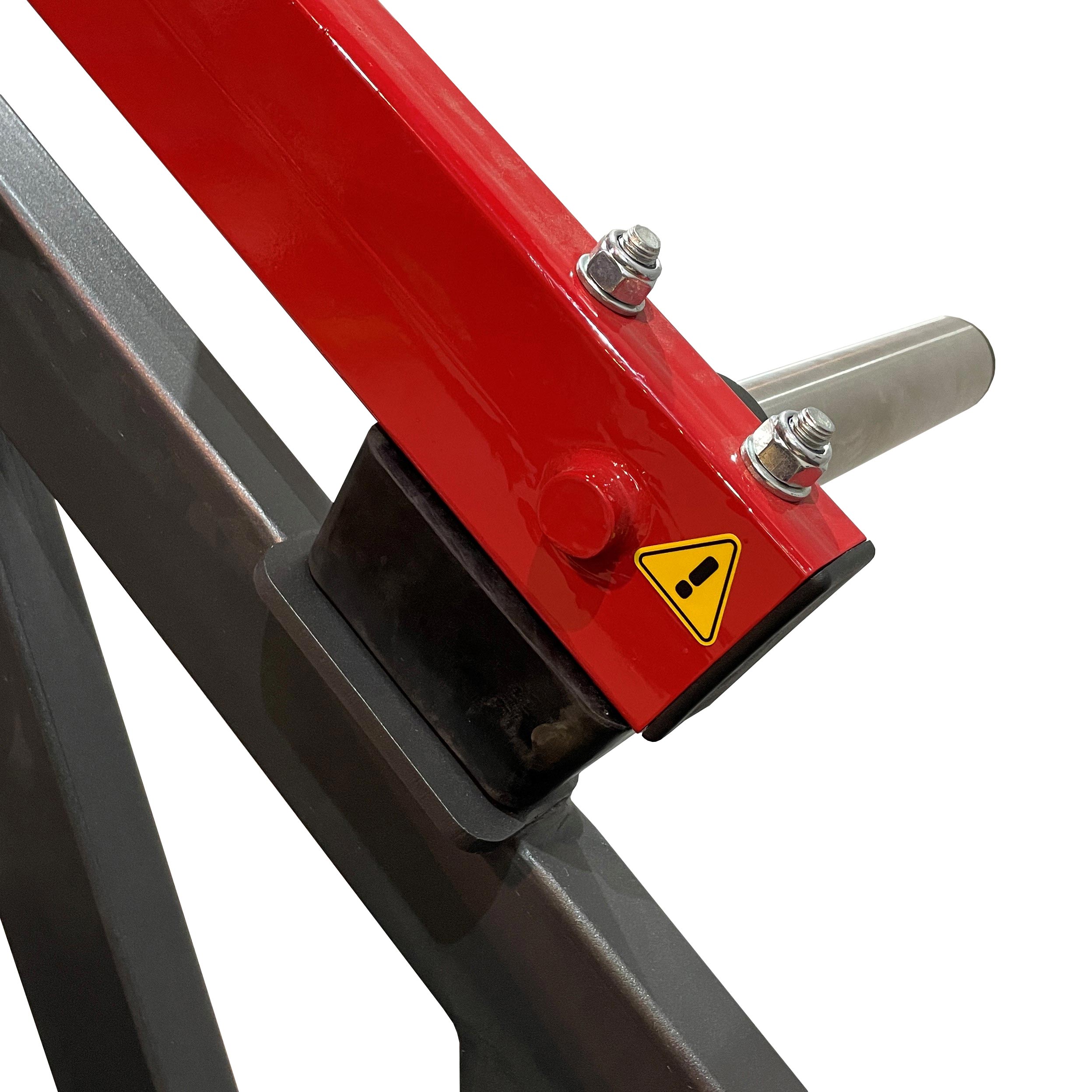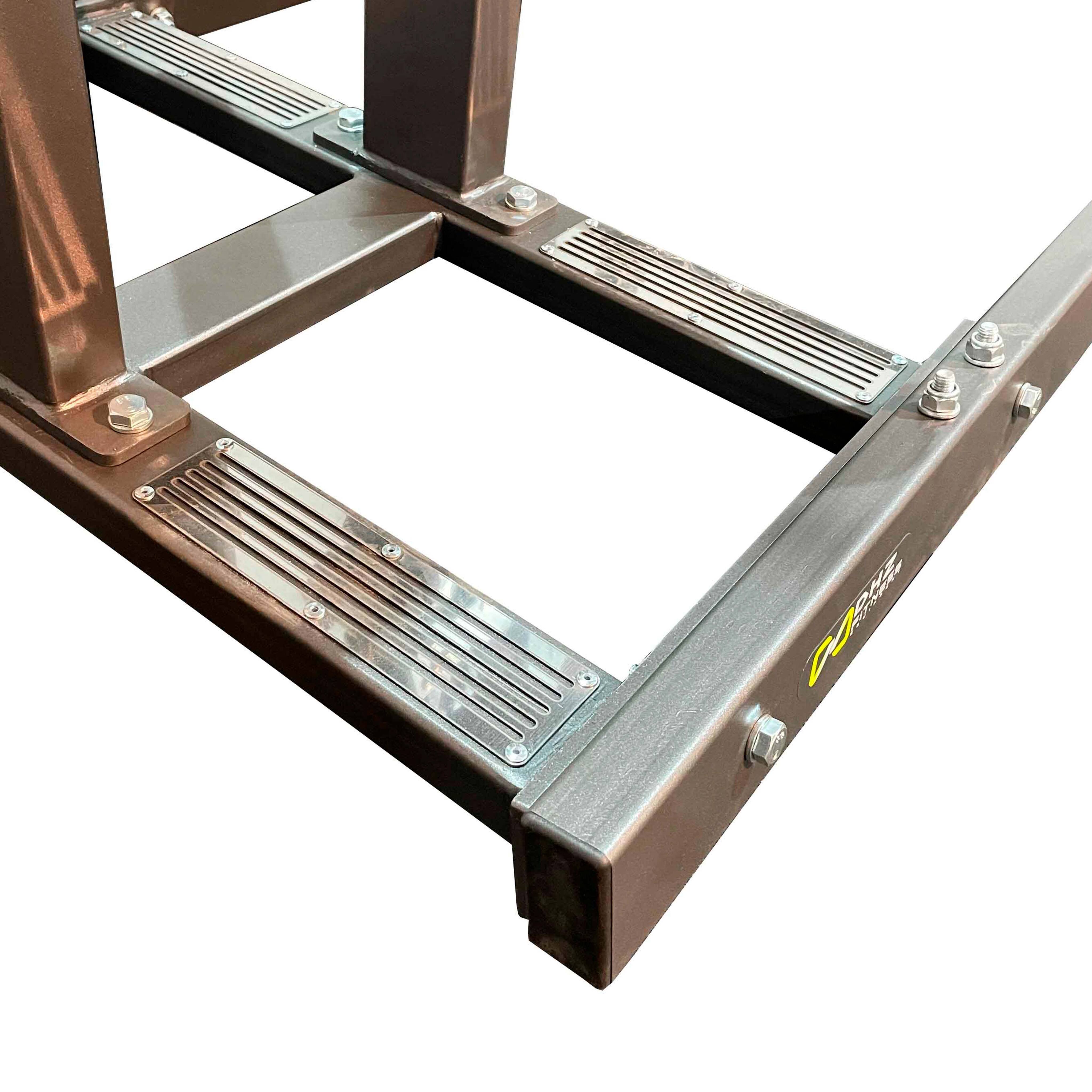 На раме закреплены металлические рубчатые пластины для защиты тренажера от износа и спортсмена от скольжения при выполнении упражнения.