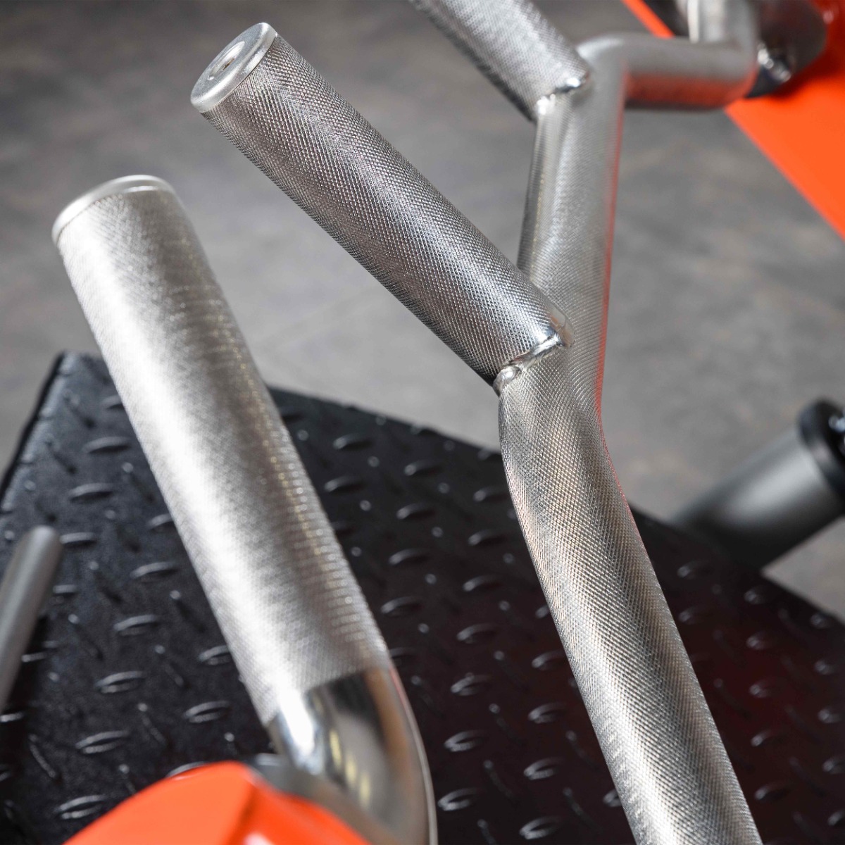 Профессиональный тренажёр для коммерческого использования T923 Наклонная тяга к поясу предназначен для базовой проработки широчайших мышц спины, трапециевидных, ромбовидных и задних пучков дельтовидных мышц, а также бицепсов и предплечий. Конструкция обеспечивает естественную траекторию движения, позволяет выполнять упражнения в разных вариантах хвата и изменять угол положения корпуса для акцента на целевых группах мышц.