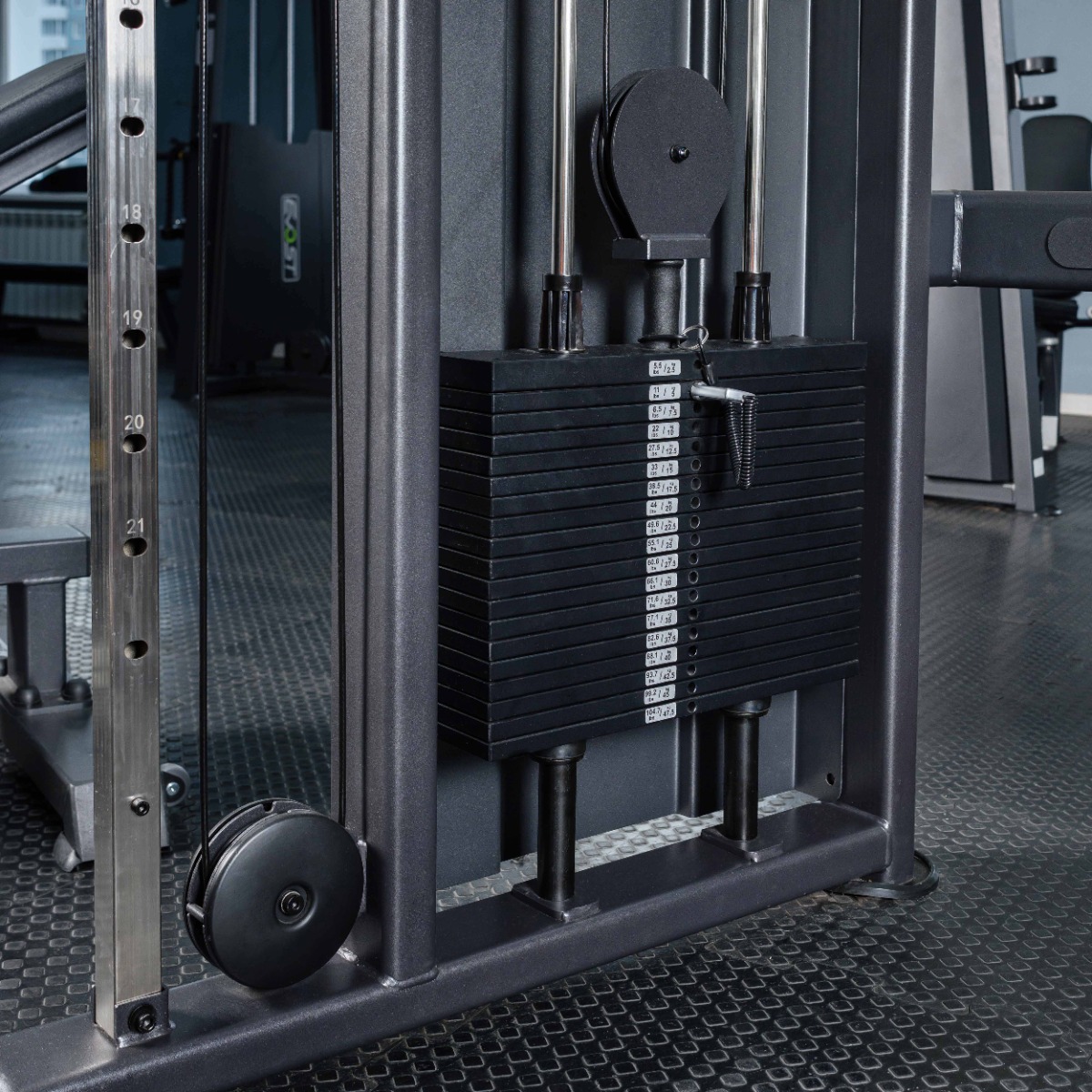Силовой тренажер «E-1017В Комплекс для функциональных тренировок», соответствующий всем требованиям профессионального оборудования. Конструктивные элементы рамы изготовлены из высококачественной стали, покрыты износостойкой двухслойной полимерной краской. Толщина профиля 3 мм имеет большой радиус угла, что придает тренажеру более элегантный внешний вид. Резиновые подпятники обеспечивают устойчивость и предотвращают повреждение полового покрытия в помещении. Для приведения грузоблока в движение используется трос диаметром 5,8 мм.