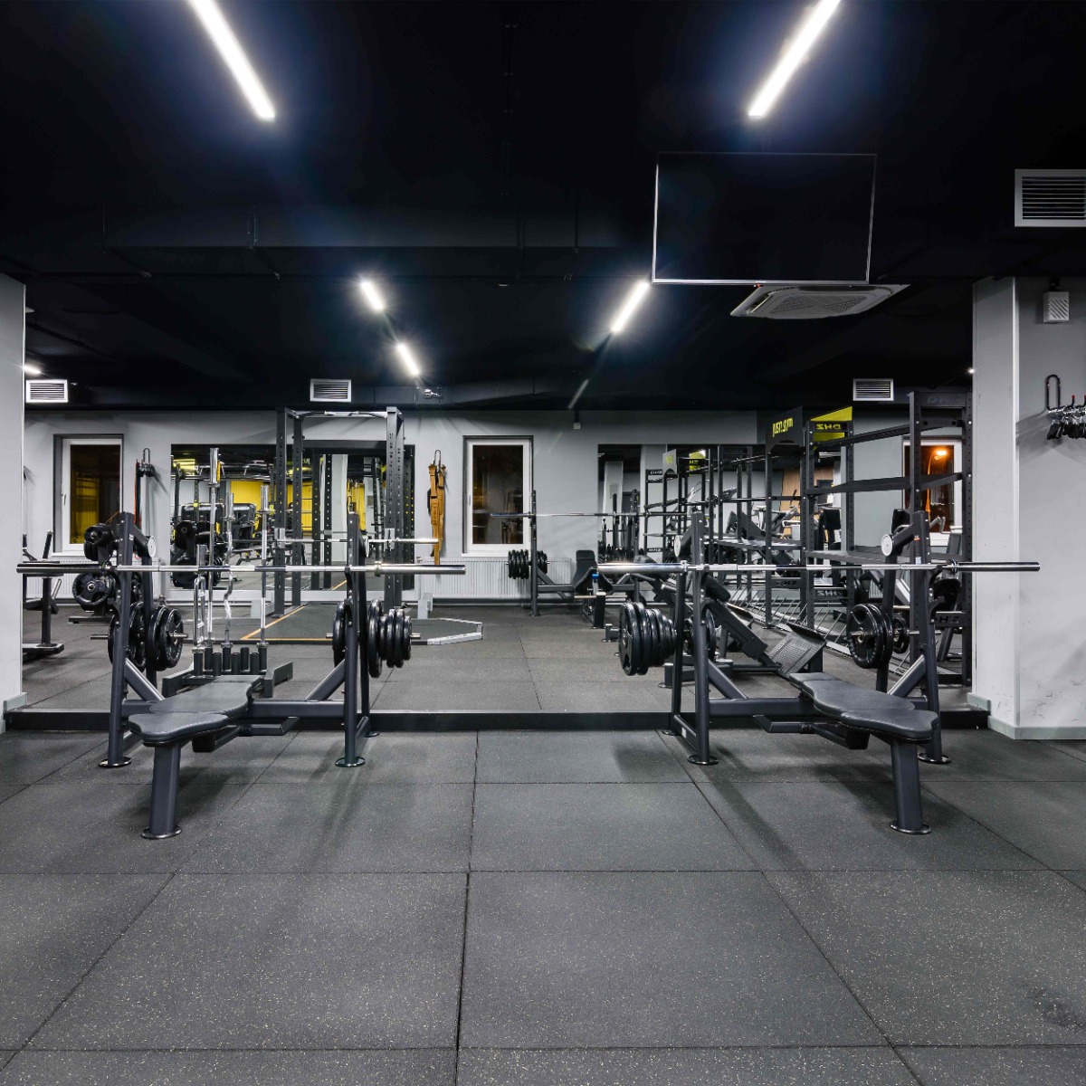 На раме тренажера закреплены двухуровневые опоры из пластика с четырьмя ложементами для фиксации штанги и предотвращения механического воздействия на раму и покрытие.