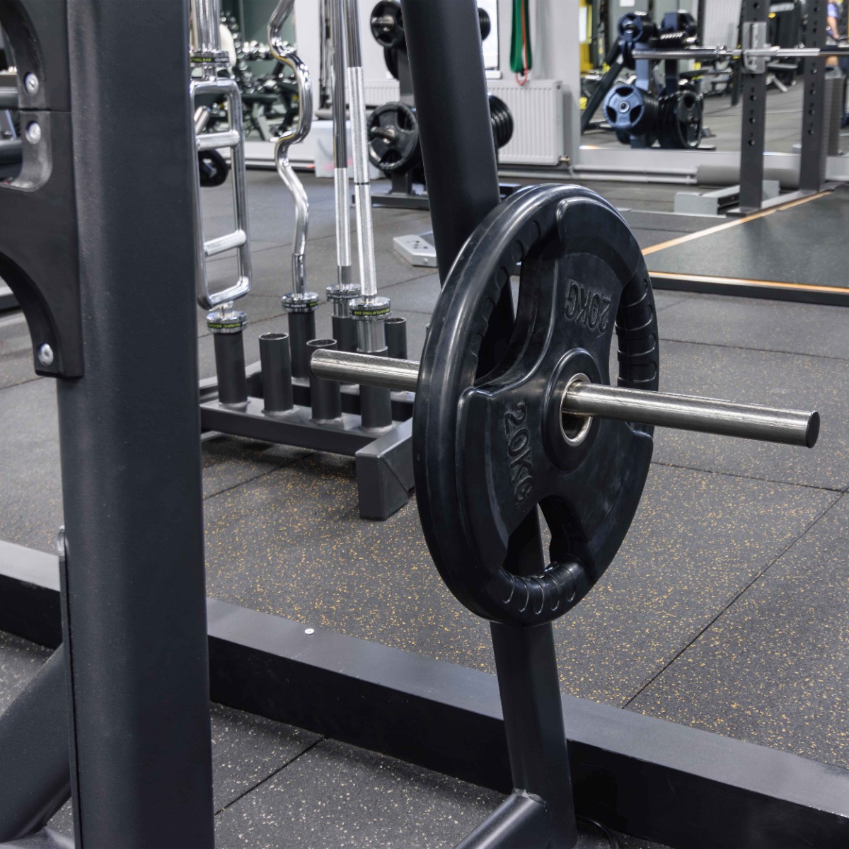На раме закреплены четыре металлических накопителя для хранения свободных весов, оборудованные кольцами из плотной резины для предотвращения механических повреждений при соприкосновении дисков с рамой.