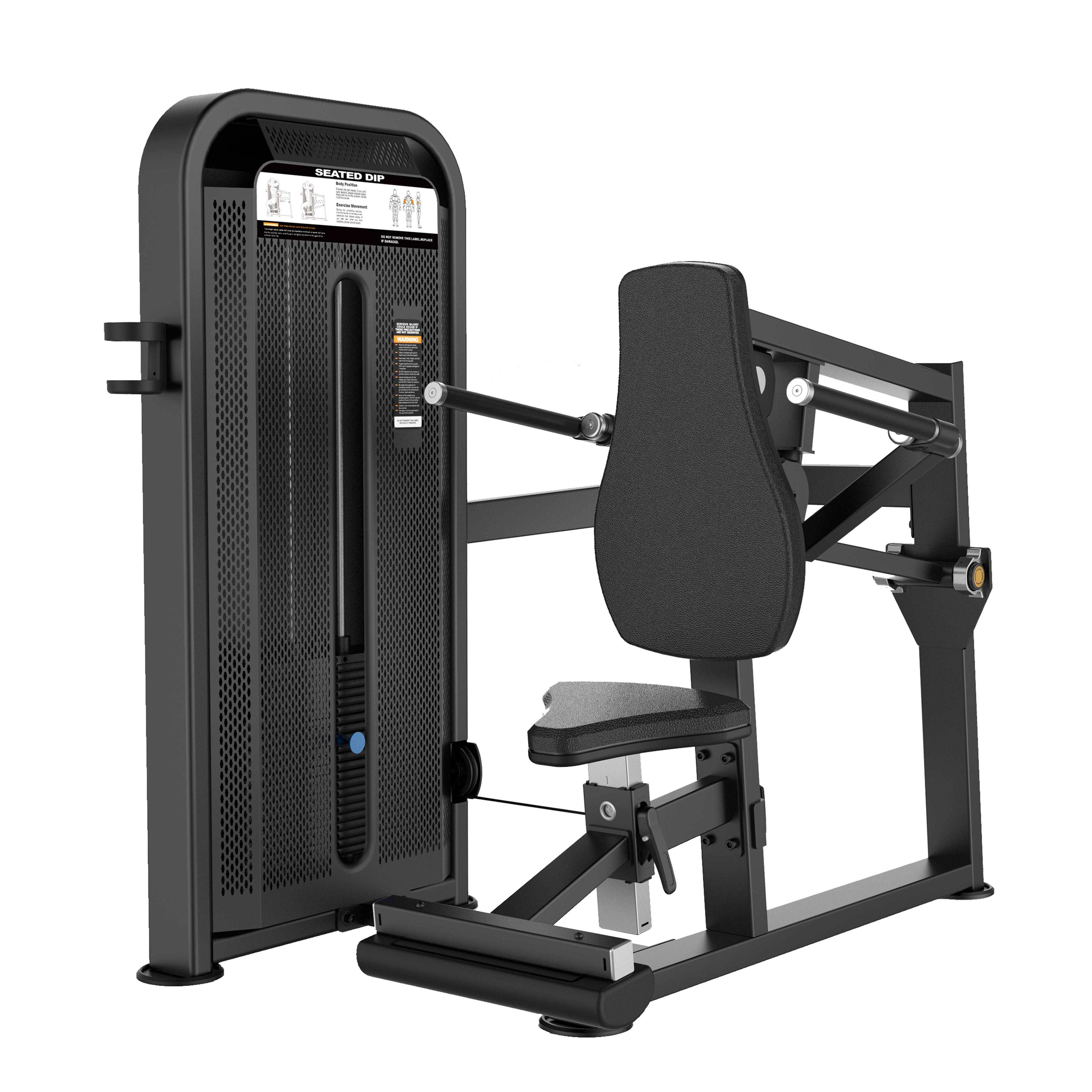Тренажер предназначен для выполнения упражнения на развитие широчайших мышц спины, трицепса и мышц грудной клетки. Выполняемое движение: жим вниз, естественная имитация рабочих движений при отжимании на брусьях.