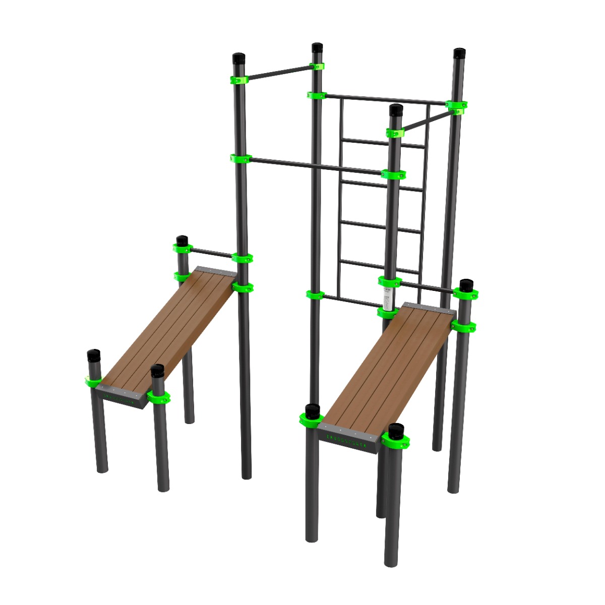 Перекладины шведской стенки и трёх турников, перекладины-опоры для ног на скамьях выполнены из металлической трубы диаметром 34 мм с толщиной стенки 3,2 мм.