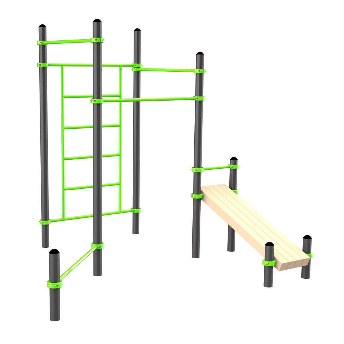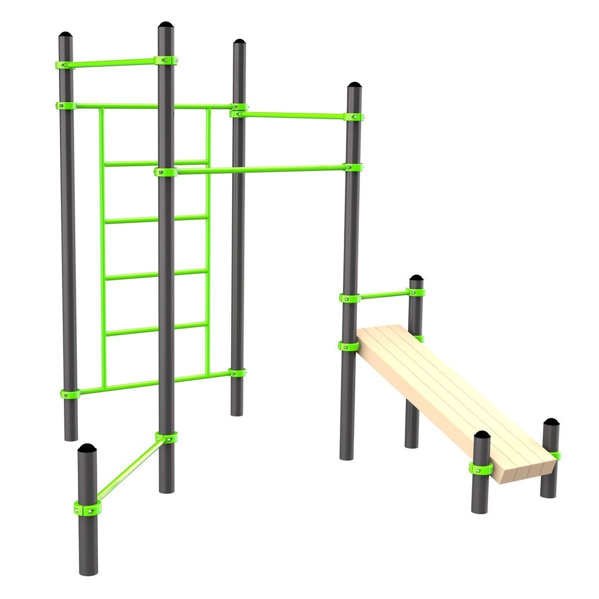 Перекладины шведской стенки, турников, перекладина для отжиманий, перекладина-опора для ног на скамье выполнены из металлической трубы диаметром 34 мм с толщиной стенки 3,2 мм.