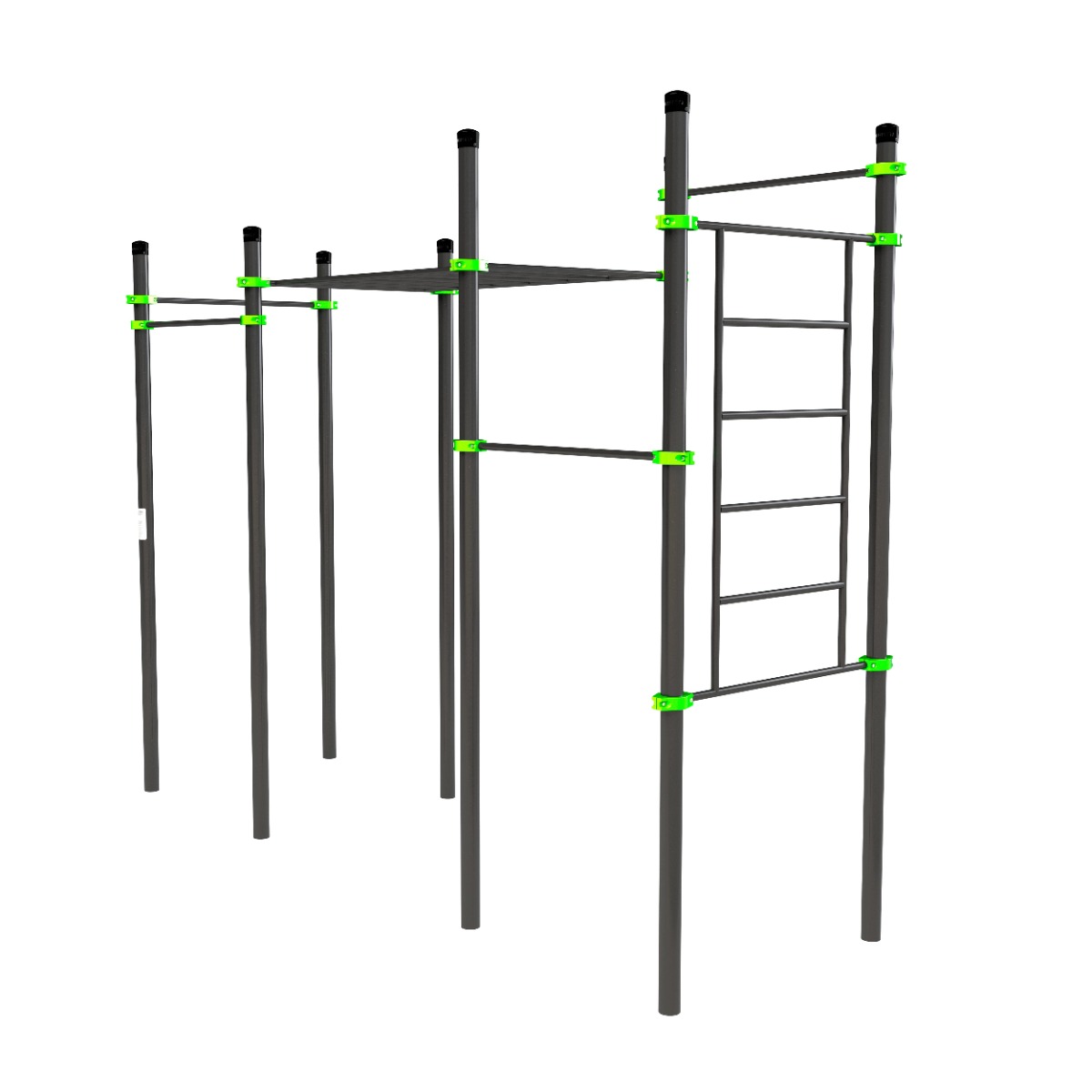 Перекладины шведской стенки, пяти турников длиной 1200 мм, классического горизонтального рукохода выполнены из металлической трубы диаметром 34 мм с толщиной стенки 3,2 мм.