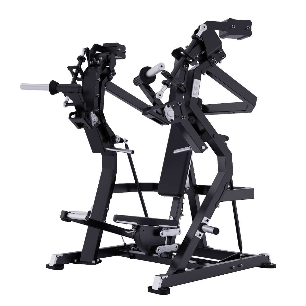На подвижных рычагах для работы со свободными весами установлено два литых хромированных накопителя из толстостенной стальной трубы длиной 300 мм для дисков с посадочным диаметром 50 мм.