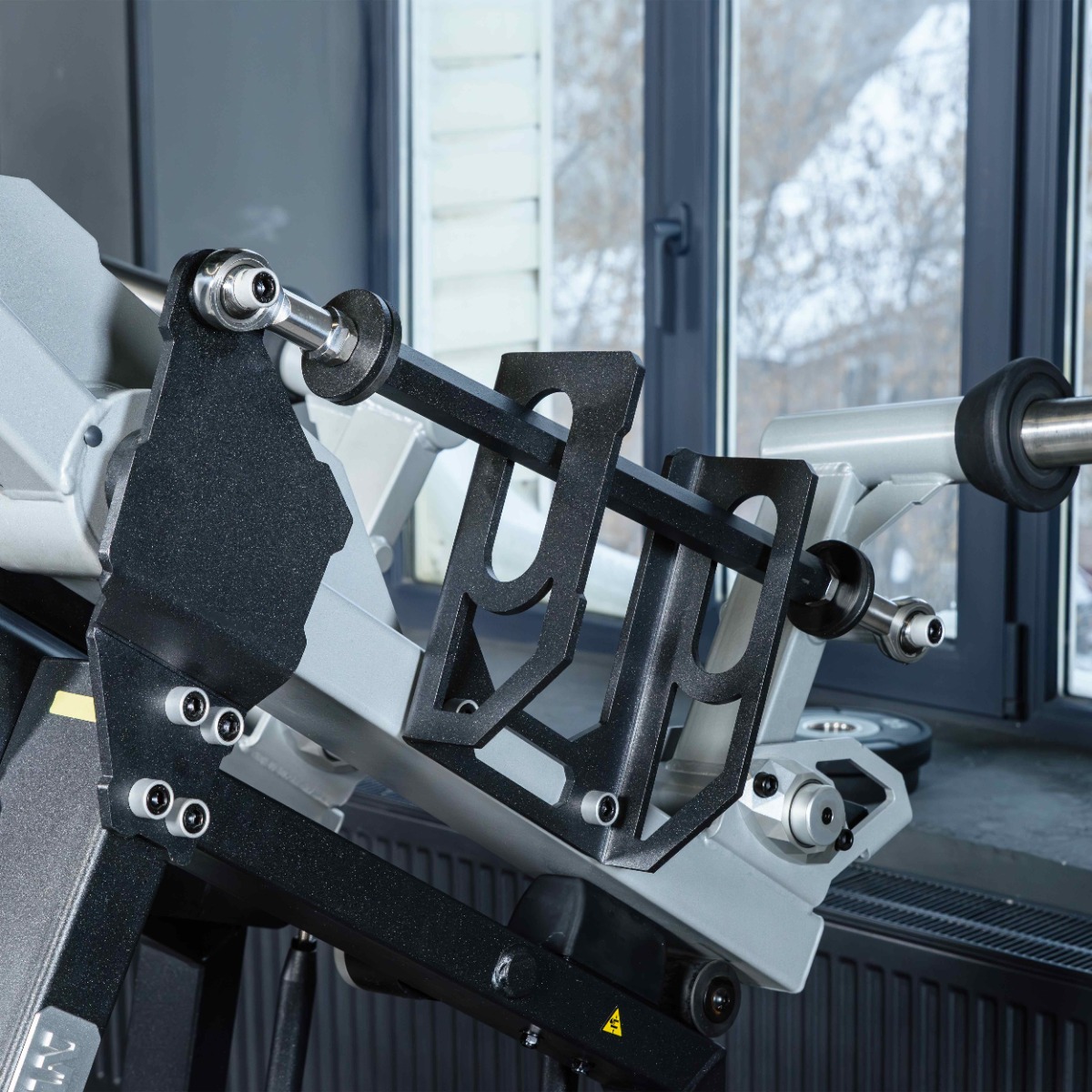 Накопители на подвижных рычагах и статичные для хранения оборудованы кольцами из плотной резины для предотвращения соприкосновения дисков с рамой тренажера и амортизации при размещении свободных весов на накопителях.